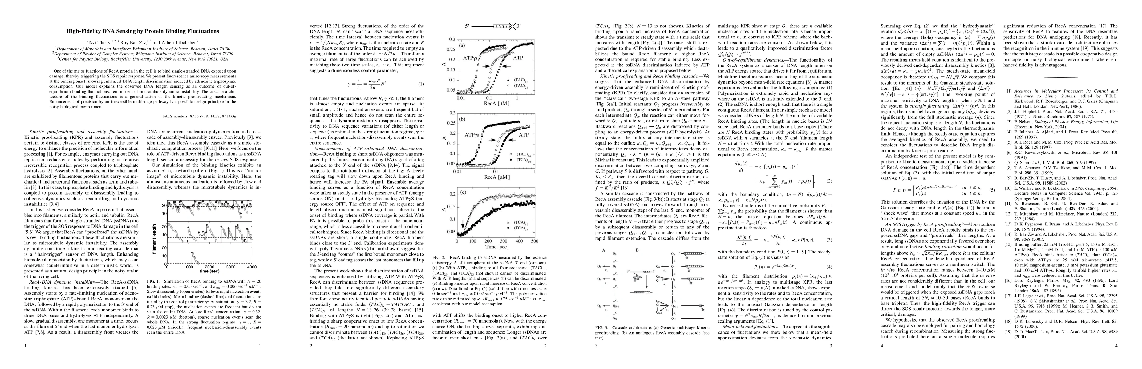 One of the major functions of RecA protein in the cell is to bind single-stranded DNA exposed upon damage, thereby triggering the SOS repair response.We present fluorescence anisotropy measurements at the binding onset, showing enhanced DNA length discrimination induced by adenosine triphosphate consumption. Our model explains the observed DNA length sensing as an outcome of out-of equilibrium binding fluctuations, reminiscent of microtubule dynamic instability. The cascade architecture of the binding fluctuations is a generalization of the kinetic proofreading mechanism. Enhancement of precision by an irreversible multistage pathway is a possible design principle in the noisy biological environment.