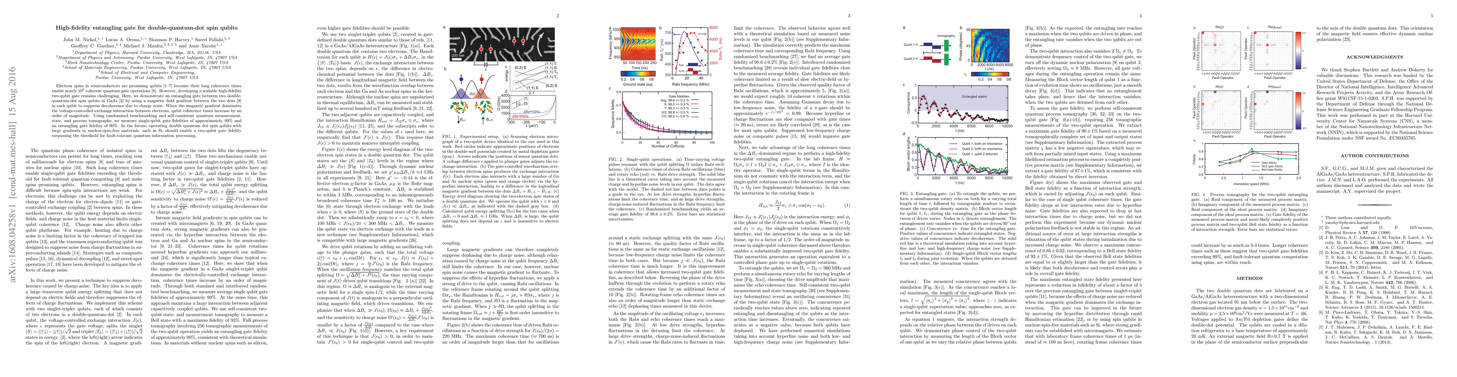 This research demonstrates a high-fidelity entangling gate for double-quantum-dot spin qubits in GaAs, achieving single-qubit gate fidelities of about 99% and an entangling gate fidelity of 90%. The use of magnetic field gradients to suppress decoherence significantly enhances coherence times, paving the way for scalable quantum computing.