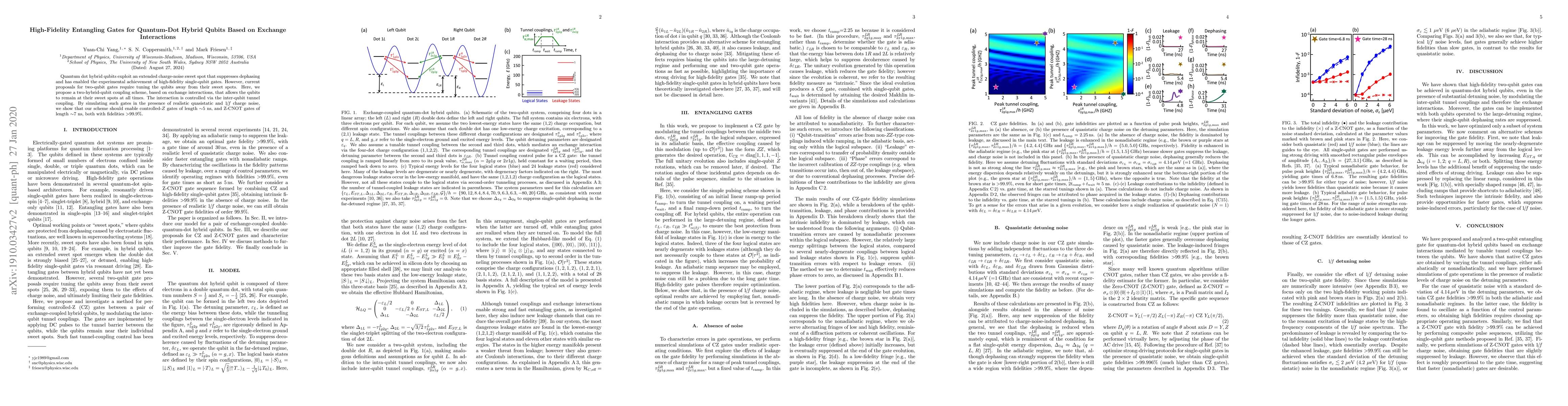 This paper proposes a novel coupling scheme for high-fidelity entangling gates in quantum-dot hybrid qubits based on exchange interactions, allowing qubits to stay in their optimal dephasing-suppressing states. Simulations demonstrate that this method can achieve controlled-Z and Z-CNOT gates with lengths of ~5 ns and ~7 ns, respectively, with fidelities exceeding 99.9%.