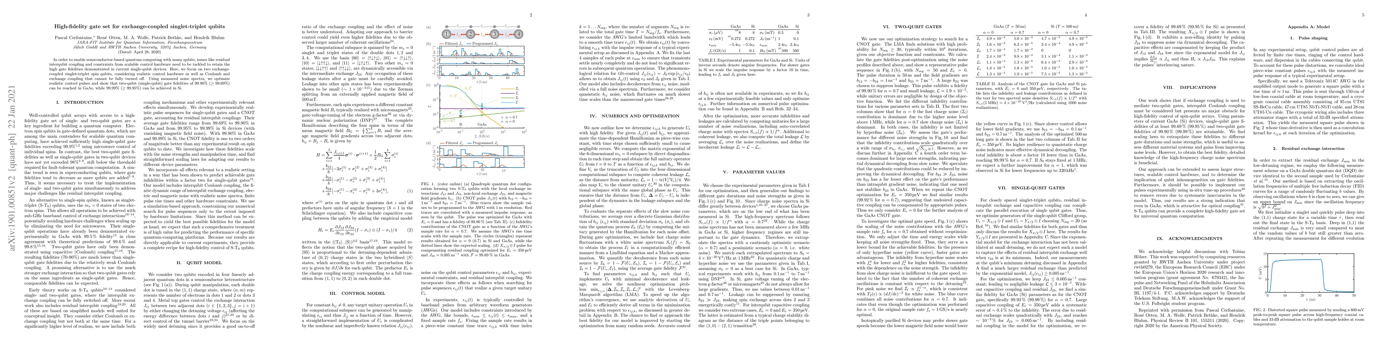This paper develops a high-fidelity gate set for exchange-coupled singlet-triplet qubits in semiconductor quantum computing, addressing residual interqubit coupling and control hardware limitations. It demonstrates gate fidelities of 99.90% for two-qubit and 99.69% for single-qubit gates in GaAs, and 99.99% and 99.95% respectively in Si.
