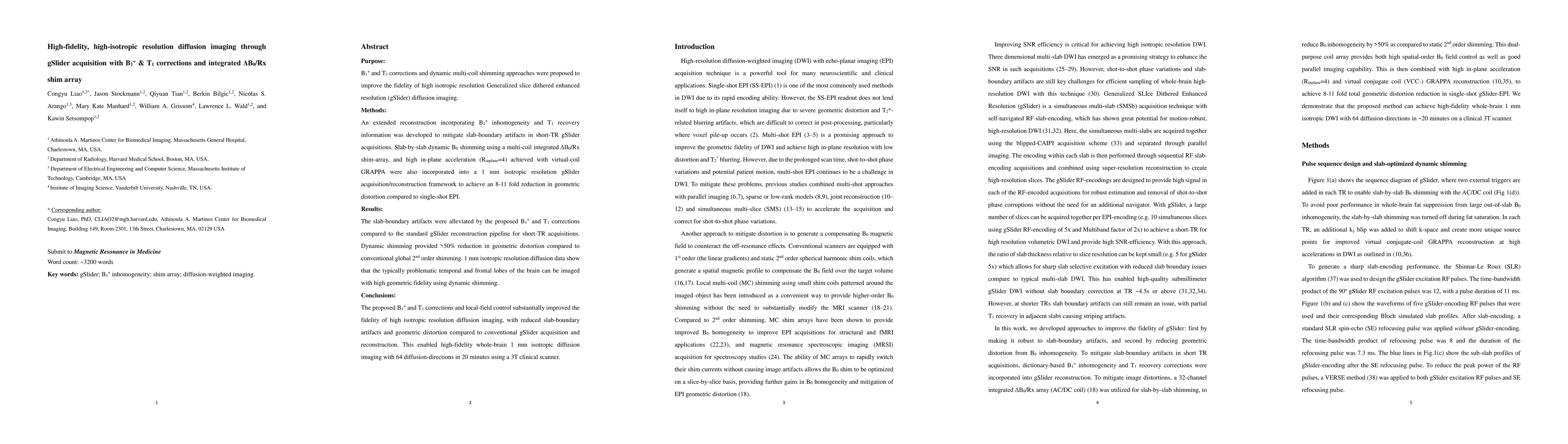 This research proposes advanced corrections and dynamic shimming techniques to enhance high isotropic resolution diffusion imaging using gSlider acquisition. The methods include B1+ and T1 corrections, and dynamic B0 shimming with a multi-coil shim array, achieving significant reductions in geometric distortion and slab-boundary artifacts, enabling high-fidelity whole-brain imaging in 20 minutes.