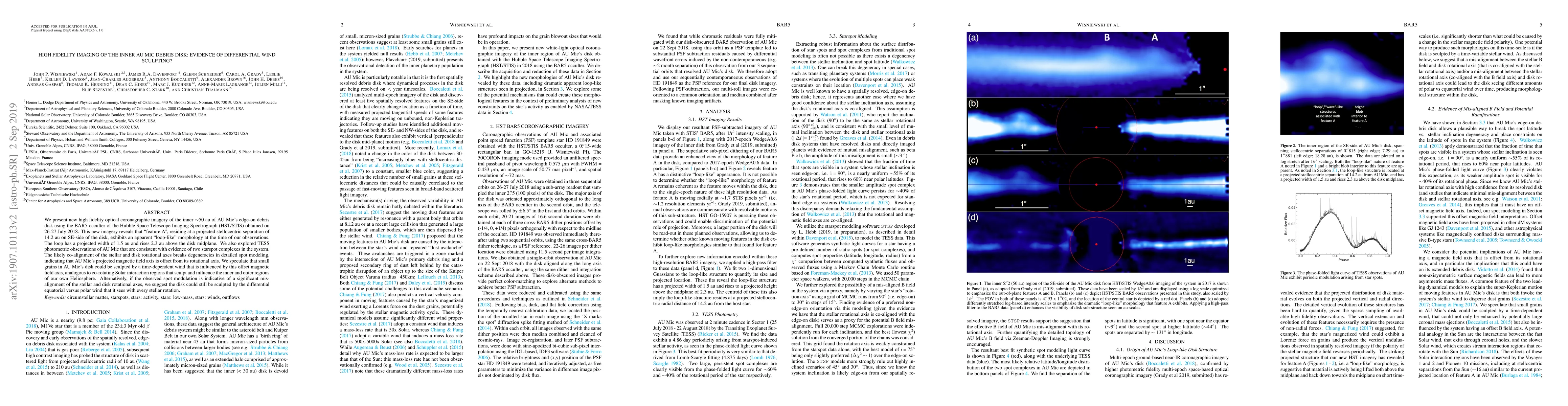 This study uses high-fidelity Hubble Space Telescope imagery to reveal a "loop-like" feature in AU Mic's debris disk, suggesting differential wind sculpting. The findings are supported by TESS observations indicating two starspot complexes, hinting at a misalignment between the star's magnetic and rotational axes.
