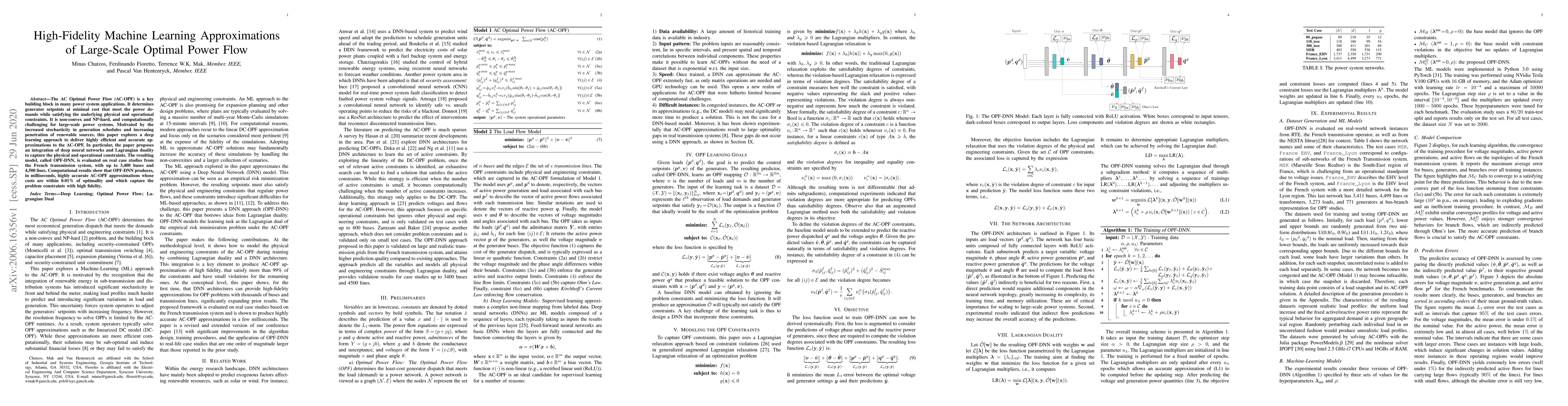 The AC Optimal Power Flow (AC-OPF) is a key building block in many power system applications. It determines generator setpoints at minimal cost that meet the power demands while satisfying the underlying physical and operational constraints. It is non-convex and NP-hard, and computationally challenging for large-scale power systems. Motivated by the increased stochasticity in generation schedules and increasing penetration of renewable sources, this paper explores a deep learning approach to deliver highly efficient and accurate approximations to the AC-OPF. In particular, the paper proposes an integration of deep neural networks and Lagrangian duality to capture the physical and operational constraints. The resulting model, called OPF-DNN, is evaluated on real case studies from the French transmission system, with up to 3,400 buses and 4,500 lines. Computational results show that OPF-DNN produces highly accurate AC-OPF approximations whose costs are within 0.01% of optimality. OPF-DNN generates, in milliseconds, solutions that capture the problem constraints with high fidelity.
