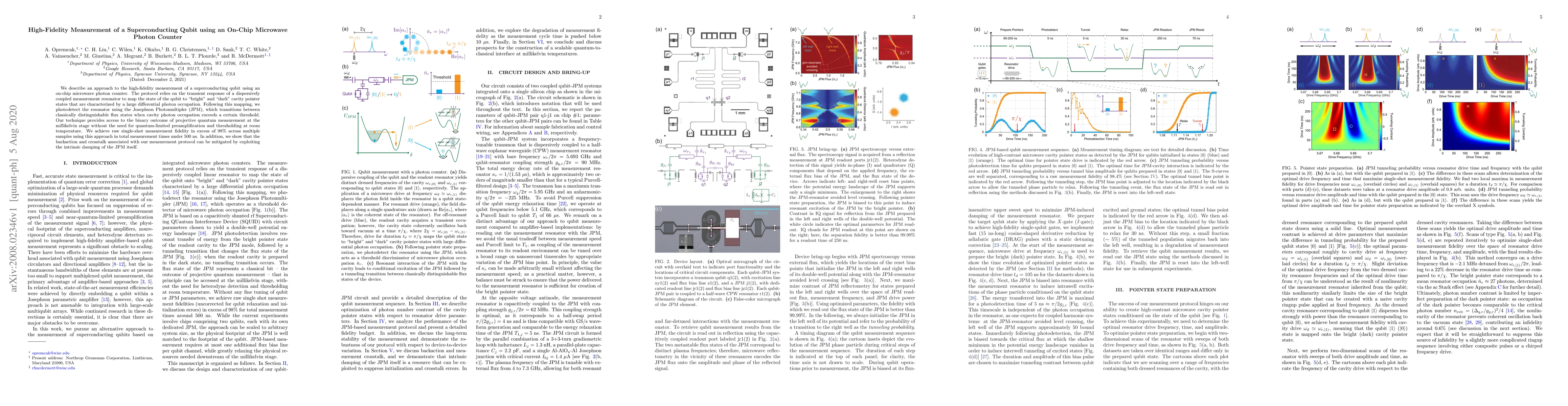 This paper presents a high-fidelity measurement technique for superconducting qubits using an on-chip microwave photon counter, achieving over 98% single-shot measurement fidelity in under 500 ns without the need for room-temperature amplification. The method mitigates backaction and crosstalk by leveraging the intrinsic damping properties of the Josephson Photomultipler.