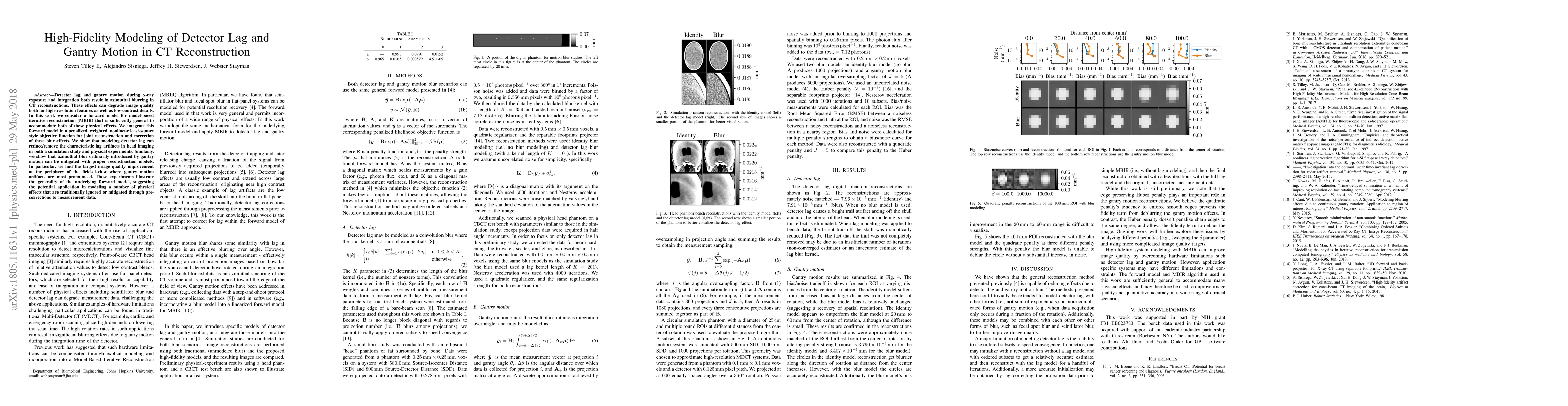 This paper proposes a forward model for model-based iterative reconstruction (MBIR) to address detector lag and gantry motion in CT scans, demonstrating significant reductions in image blur and artifacts, particularly at the periphery of the field-of-view. The study shows promising results in both simulated and physical experiments, indicating the model's potential for broader applications in CT reconstruction.