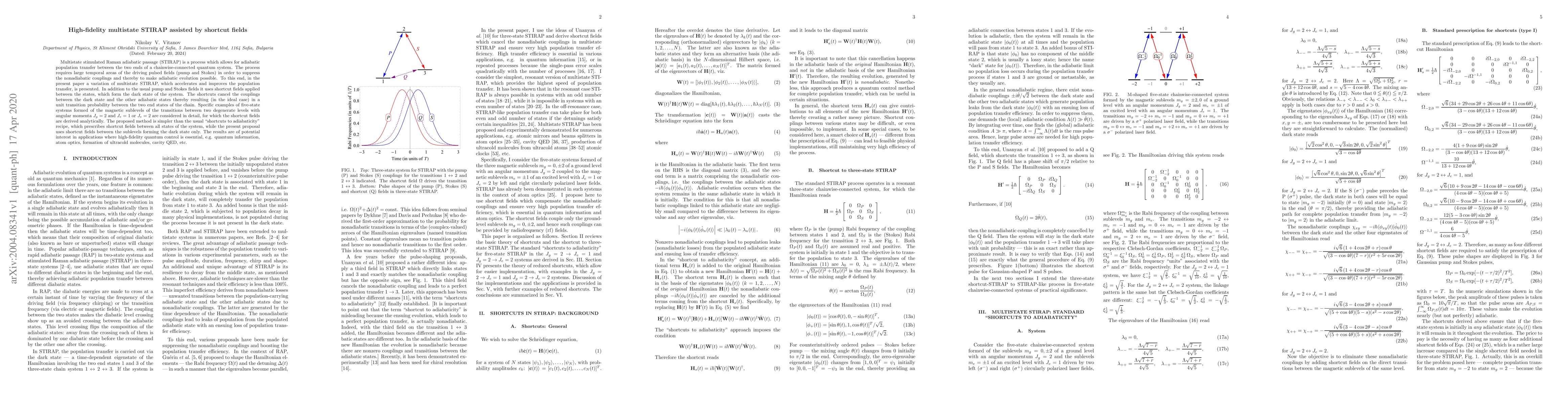 This paper presents a high-fidelity multistate STIRAP process enhanced by shortcut fields, which simplifies population transfer by applying fields only between sublevels forming the dark state. The method improves adiabatic evolution and achieves near-perfect transition probabilities in five-state quantum systems, with potential applications in quantum information and atom optics.