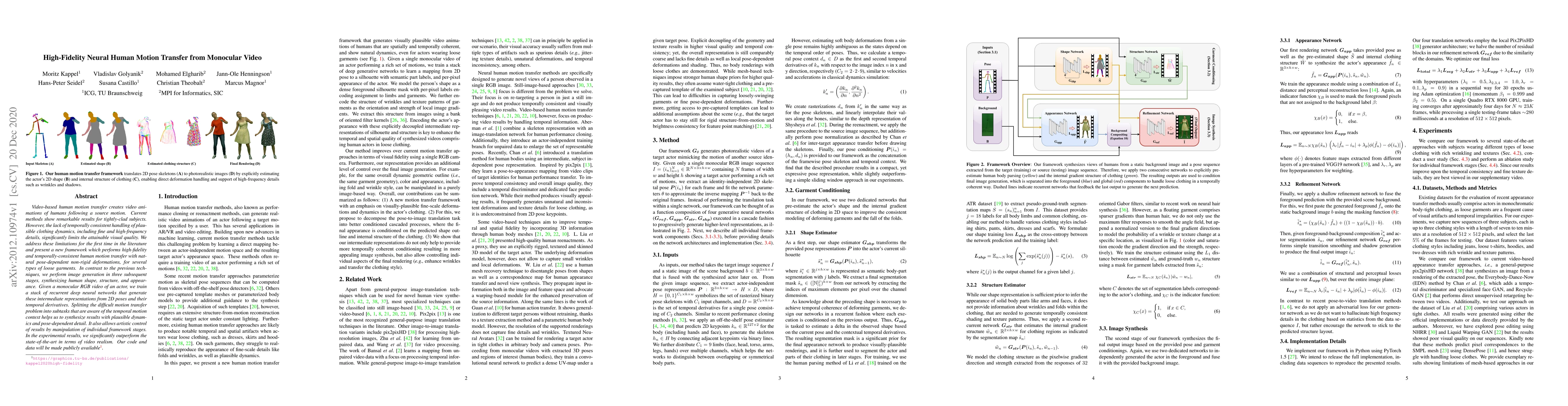 This paper introduces a new framework for high-fidelity neural human motion transfer from monocular video, focusing on achieving temporally consistent and realistic clothing dynamics. The method decomposes the problem into three stages to generate human shape, structure, and appearance, significantly outperforming previous techniques in video realism.