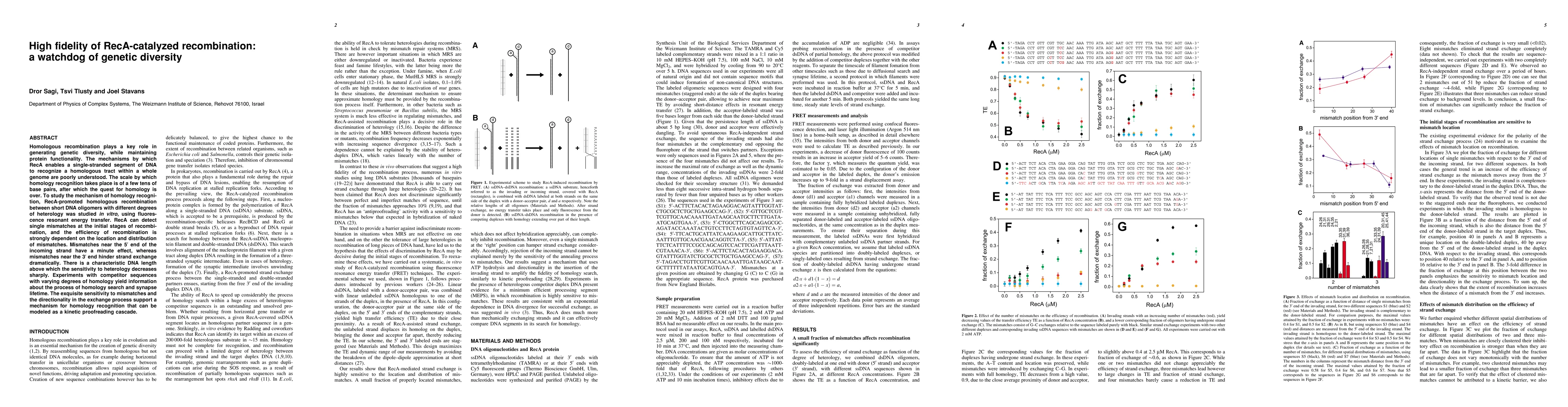 Homologous recombination plays a key role in generating genetic diversity, while maintaining protein functionality. The mechanisms by which RecA enables a single-stranded segment of DNA to recognize a homologous tract within a whole genome are poorly understood. The scale by which homology recognition takes place is of a few tens of base pairs, after which the quest for homology is over. To study the mechanism of homology recognition, RecA-promoted homologous recombination between short DNA oligomers with different degrees of heterology was studied in vitro, using fluorescence resonant energy transfer. RecA can detect single mismatches at the initial stages of recombination, and the efficiency of recombination is strongly dependent on the location and distribution of mismatches. Mismatches near the 5' end of the incoming strand have a minute effect, whereas mismatches near the 3' end hinder strand exchange dramatically. There is a characteristic DNA length above which the sensitivity to heterology decreases sharply. Experiments with competitor sequences with varying degrees of homology yield information about the process of homology search and synapse lifetime. The exquisite sensitivity to mismatches and the directionality in the exchange process support a mechanism for homology recognition that can be modeled as a kinetic proofreading cascade.