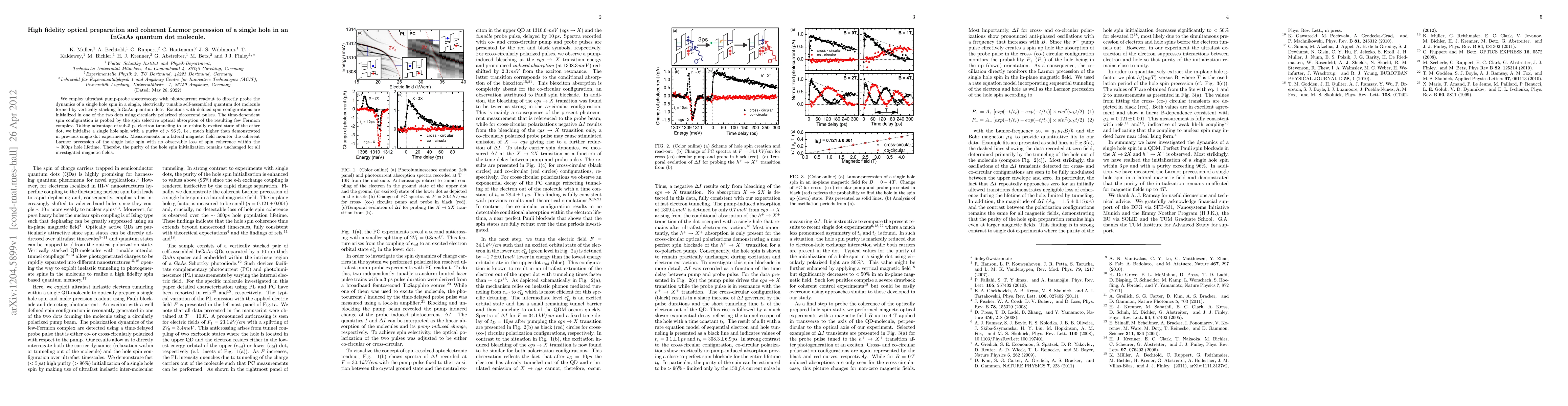 The paper reports on the high fidelity optical preparation and coherent Larmor precession of a single hole spin in an InGaAs quantum dot molecule, achieving over 96% purity, and observes no loss of spin coherence during its ~300 ps lifetime in a lateral magnetic field.
