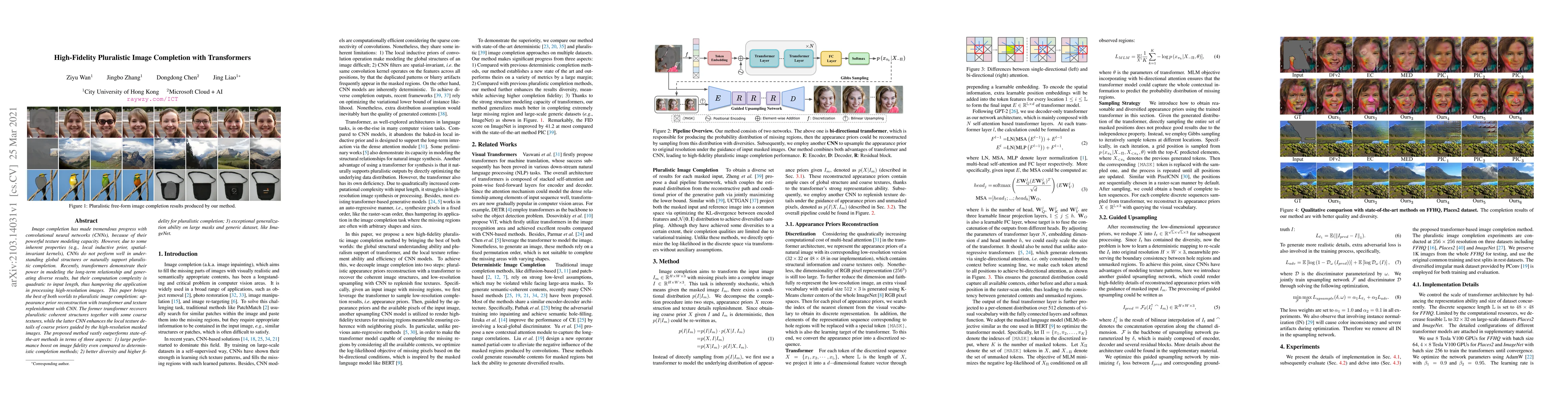 This paper proposes a hybrid method combining transformers for global structure and pluralistic completion with CNNs for texture details to achieve high-fidelity image completion, outperforming state-of-the-art methods in fidelity, diversity, and generalization.