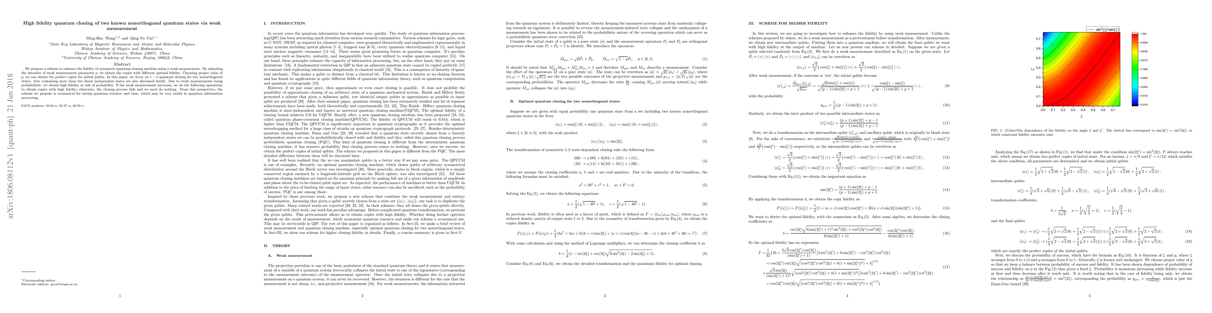 This paper proposes a scheme for high fidelity quantum cloning of two known nonorthogonal quantum states using weak measurement, achieving optimal fidelity by adjusting the weak measurement parameter $p$. The method is economical in terms of quantum resources and time, making it useful for quantum information processing.