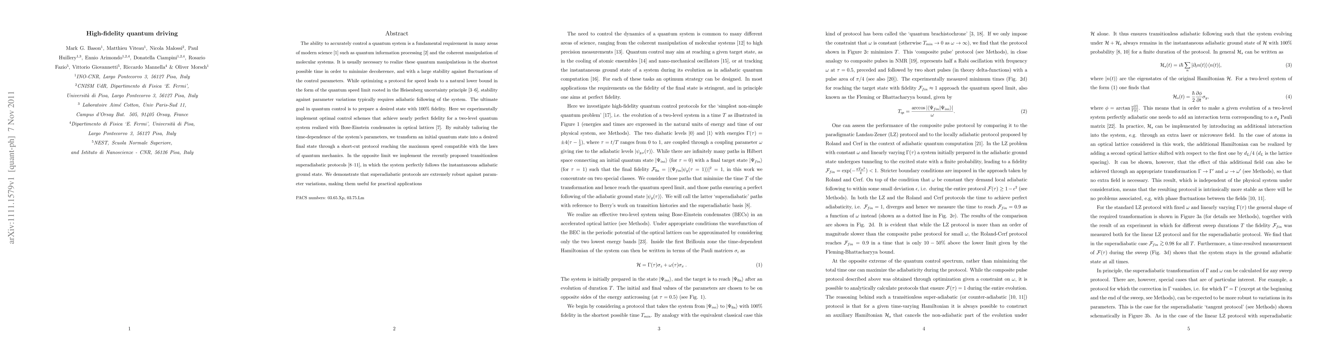 The ability to accurately control a quantum system is a fundamental requirement in many areas of modern science such as quantum information processing and the coherent manipulation of molecular systems. It is usually necessary to realize these quantum manipulations in the shortest possible time in order to minimize decoherence, and with a large stability against fluctuations of the control parameters. While optimizing a protocol for speed leads to a natural lower bound in the form of the quantum speed limit rooted in the Heisenberg uncertainty principle, stability against parameter variations typically requires adiabatic following of the system. The ultimate goal in quantum control is to prepare a desired state with 100% fidelity. Here we experimentally implement optimal control schemes that achieve nearly perfect fidelity for a two-level quantum system realized with Bose-Einstein condensates in optical lattices. By suitably tailoring the time-dependence of the system's parameters, we transform an initial quantum state into a desired final state through a short-cut protocol reaching the maximum speed compatible with the laws of quantum mechanics. In the opposite limit we implement the recently proposed transitionless superadiabatic protocols, in which the system perfectly follows the instantaneous adiabatic ground state. We demonstrate that superadiabatic protocols are extremely robust against parameter variations, making them useful for practical applications.