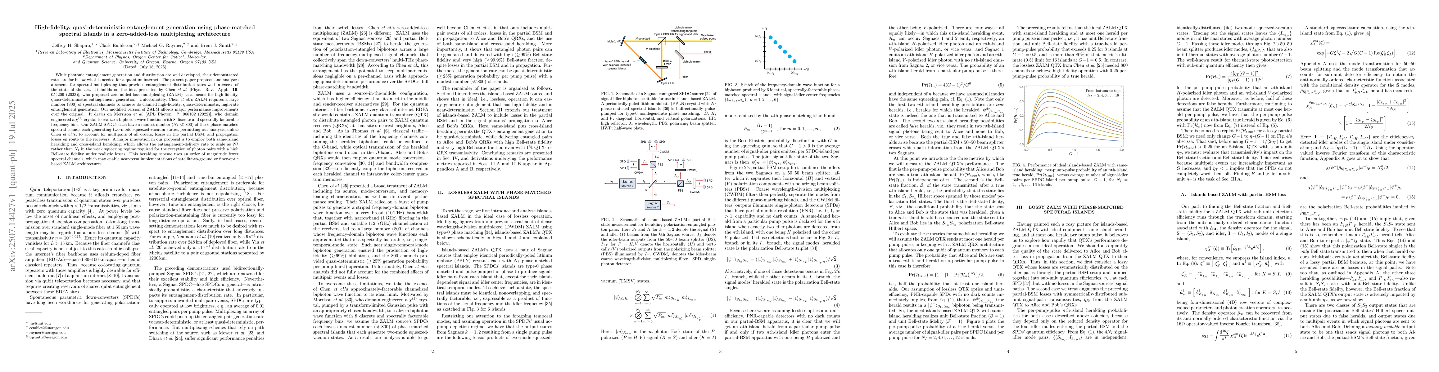 While photonic entanglement generation and distribution are well developed, their demonstrated rates are far below what is needed for a quantum internet. The present paper proposes and analyzes a scheme for spectral multiplexing that provides entanglement-distribution rates well in excess of the state of the art. It builds on the idea presented by Chen~\emph{et al}.~[Phys. Rev. Appl. {\bf 19}, 054209 (2023)], who proposed zero-added-loss multiplexing (ZALM) as a means for high-fidelity, quasi-deterministic entanglement generation. Unfortunately, Chen \emph{et al}.'s ZALM requires a large number (800) of spectral channels to achieve its claimed high-fidelity, quasi-deterministic, high-rate entanglement generation. Our modified version of ZALM affords major performance improvements over the original. It draws on Morrison~\emph{et al}.~[APL Photon. {\bf 7}, 066102 (2022)], who domain engineered a $\chi^{(2)}$ crystal to realize a biphoton wave function with 8 discrete and spectrally-factorable frequency bins. Our ZALM SPDCs each have a modest number ($N_I\ll$ 800) of these phase-matched spectral islands each generating two-mode squeezed-vacuum states, permitting our analysis, unlike Chen~\emph{et al.}'s, to account for multipairs of all orders, losses in the partial BSM, and propagation losses en route to the receivers. A major innovation in our proposal is to employ both same-island heralding and cross-island heralding, which allows the entanglement-delivery rate to scale as $N_I^2$ rather than $N_I$ in the weak squeezing regime required for the reception of photon pairs with a high Bell-state fidelity under realistic losses. This heralding scheme uses an order of magnitude fewer spectral channels, which may enable near-term implementations of satellite-to-ground or fiber-optic based ZALM architectures.