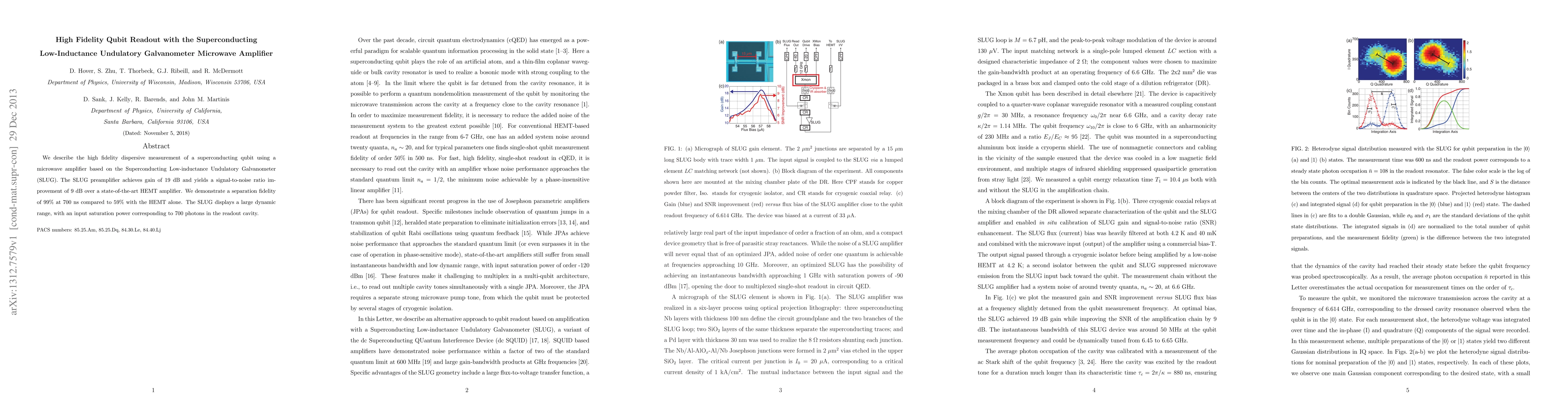 This paper presents a high fidelity qubit readout using a Superconducting Low-inductance Undulatory Galvanometer (SLUG) microwave amplifier, achieving a 19 dB gain and 9 dB signal-to-noise ratio improvement over HEMT amplifiers, resulting in a 99% separation fidelity.