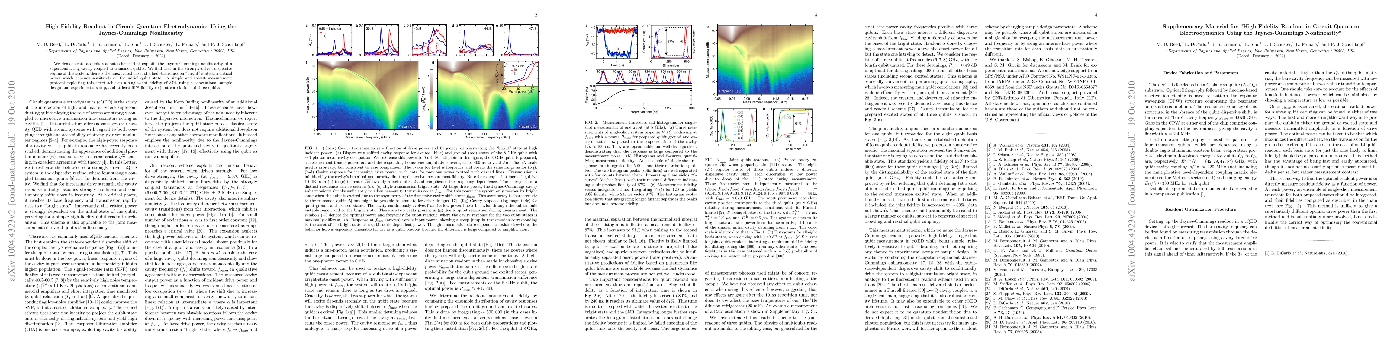This paper demonstrates a high-fidelity qubit readout scheme utilizing the Jaynes-Cummings nonlinearity in a superconducting cavity coupled to transmon qubits, achieving 87% single-shot fidelity and 61% fidelity for joint qubit correlations. The method exploits a high-transmission "bright" state that emerges at a critical power dependent on the initial qubit state.