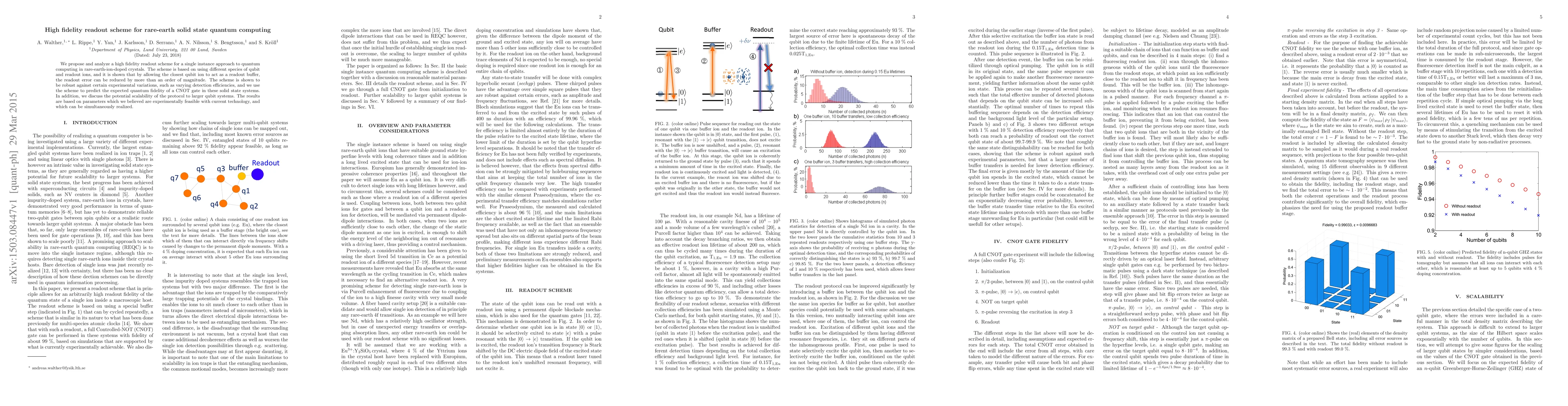We propose and analyze a high fidelity readout scheme for a single instance approach to quantum computing in rare-earth-ion-doped crystals. The scheme is based on using different species of qubit and readout ions, and it is shown that by allowing the closest qubit ion to act as a readout buffer, the readout error can be reduced by more than an order of magnitude. The scheme is shown to be robust against certain experimental variations, such as varying detection efficiencies, and we use the scheme to predict the expected quantum fidelity of a CNOT gate in these solid state systems. In addition, we discuss the potential scalability of the protocol to larger qubit systems. The results are based on parameters which we believed are experimentally feasible with current technology, and which can be simultaneously realized.
