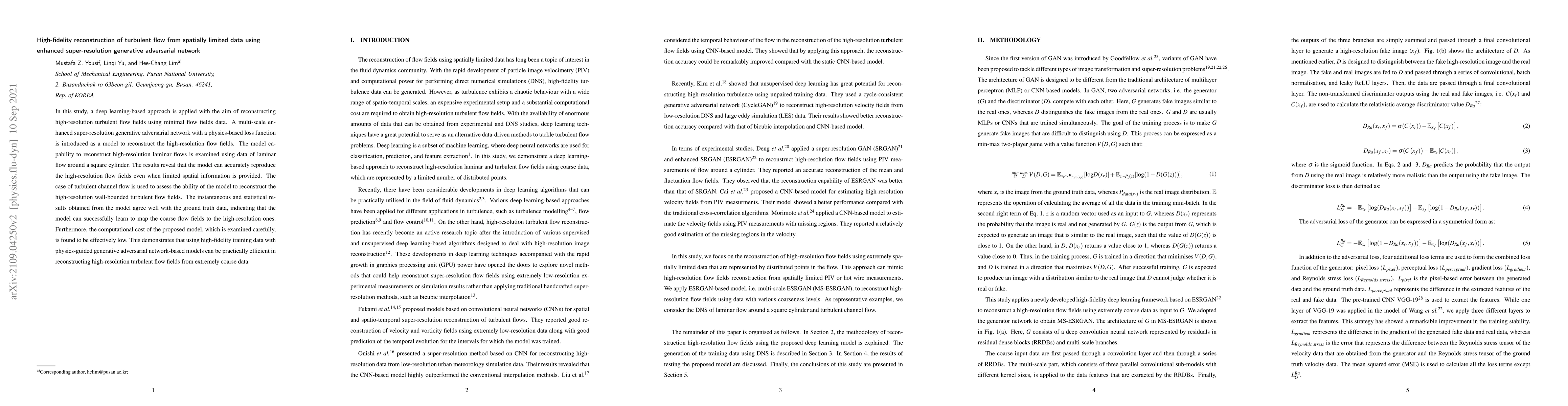 This paper introduces a deep learning model using an enhanced super-resolution generative adversarial network to reconstruct high-resolution turbulent flow fields from limited spatial data. The model accurately reproduces high-resolution flow fields, as demonstrated by laminar and turbulent flow cases, and is computationally efficient.