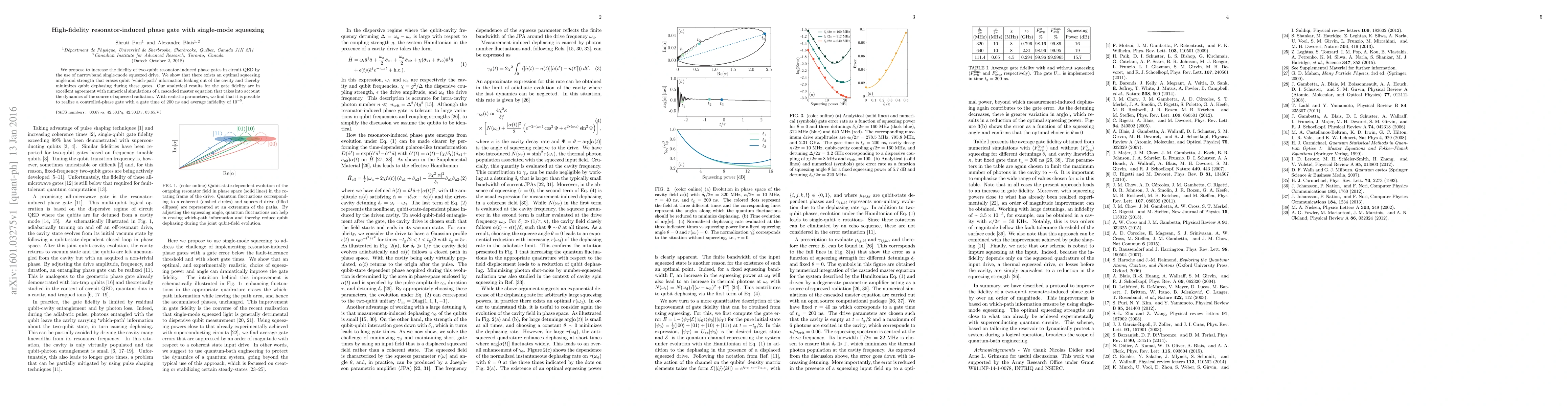 We propose to increase the fidelity of two-qubit resonator-induced phase gates in circuit QED by the use of narrowband single-mode squeezed drive. We show that there exists an optimal squeezing angle and strength that erases qubit 'which-path' information leaking out of the cavity and thereby minimizes qubit dephasing during these gates. Our analytical results for the gate fidelity are in excellent agreement with numerical simulations of a cascaded master equation that takes into account the dynamics of the source of squeezed radiation. With realistic parameters, we find that it is possible to realize a controlled-phase gate with a gate time of 200 ns and average infidelity of $10^{-5}$.
