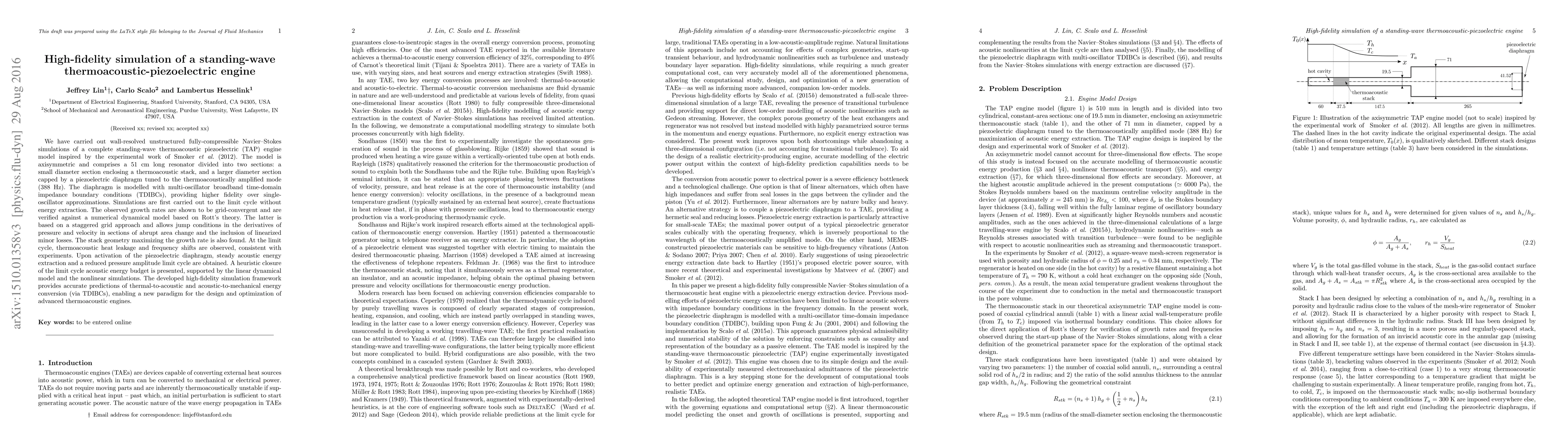 We have carried out wall-resolved unstructured fully-compressible Navier--Stokes simulations of a complete standing-wave thermoacoustic piezoelectric (TAP) engine model inspired by the experimental work of Smoker et al. (2012). The model is axisymmetric and comprises a 51 cm long resonator divided into two sections: a small diameter section enclosing a thermoacoustic stack, and a larger diameter section capped by a piezoelectric diaphragm tuned to the thermoacoustically amplified mode (388 Hz). The diaphragm is modelled with multi-oscillator broadband time-domain impedance boundary conditions (TDIBCs), providing higher fidelity over single-oscillator approximations. Simulations are first carried out to the limit cycle without energy extraction. The observed growth rates are shown to be grid-convergent and are verified against a numerical dynamical model based on Rott's theory. The latter is based on a staggered grid approach and allows jump conditions in the derivatives of pressure and velocity in sections of abrupt area change and the inclusion of linearized minor losses. The stack geometry maximizing the growth rate is also found. At the limit cycle, thermoacoustic heat leakage and frequency shifts are observed, consistent with experiments. Upon activation of the piezoelectric diaphragm, steady acoustic energy extraction and a reduced pressure amplitude limit cycle are obtained. A heuristic closure of the limit cycle acoustic energy budget is presented, supported by the linear dynamical model and the nonlinear simulations. The developed high-fidelity simulation framework provides accurate predictions of thermal-to-acoustic and acoustic-to-mechanical energy conversion (via TDIBCs), enabling a new paradigm for the design and optimization of advanced thermoacoustic engines.