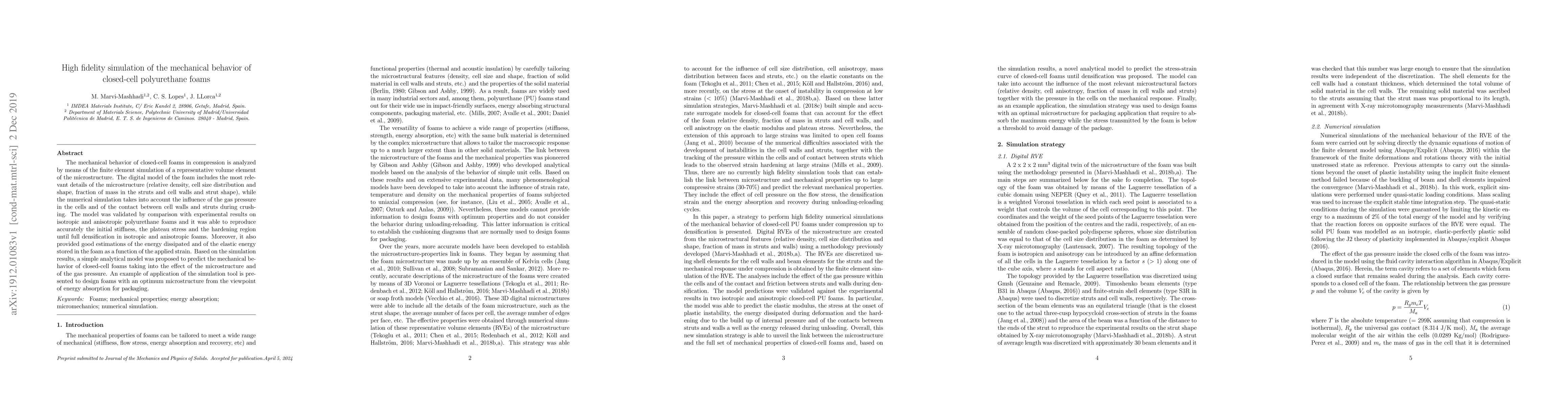 This paper presents a high-fidelity finite element simulation to analyze the mechanical behavior of closed-cell polyurethane foams under compression, validated by experimental results. The simulation accurately reproduces foam mechanical properties and aids in designing foams optimized for energy absorption.