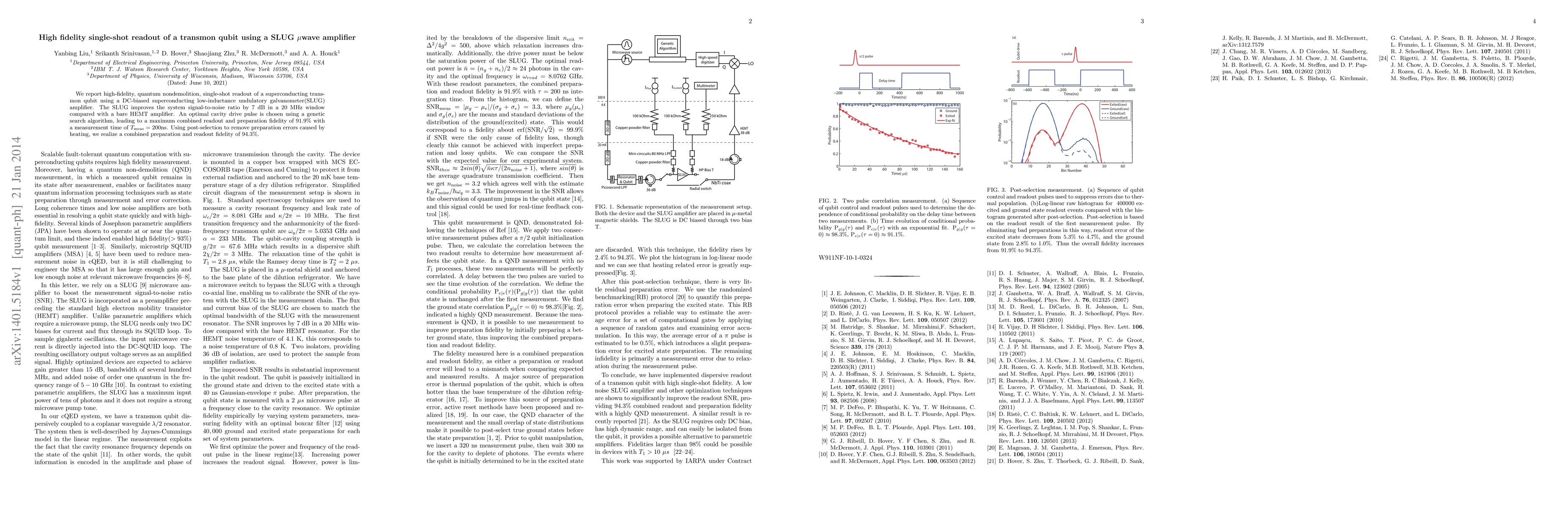 We report high-fidelity, quantum nondemolition, single-shot readout of a superconducting transmon qubit using a DC-biased superconducting low-inductance undulatory galvanometer(SLUG) amplifier. The SLUG improves the system signal-to-noise ratio by 7 dB in a 20 MHz window compared with a bare HEMT amplifier. An optimal cavity drive pulse is chosen using a genetic search algorithm, leading to a maximum combined readout and preparation fidelity of 91.9% with a measurement time of Tmeas = 200ns. Using post-selection to remove preparation errors caused by heating, we realize a combined preparation and readout fidelity of 94.3%.