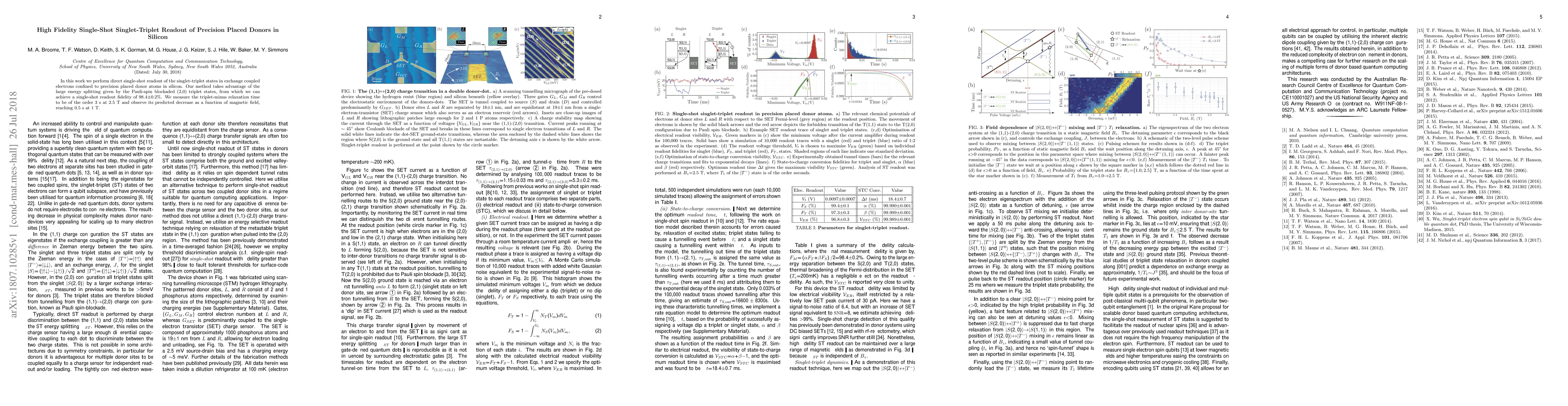 This paper presents a high-fidelity single-shot readout technique for singlet-triplet states in silicon, leveraging the Pauli-spin blockade to achieve 98.4% readout fidelity. The study also investigates the triplet-minus relaxation time, showing a predicted decrease from 3s at 2.5T to 0.5s at 1T.