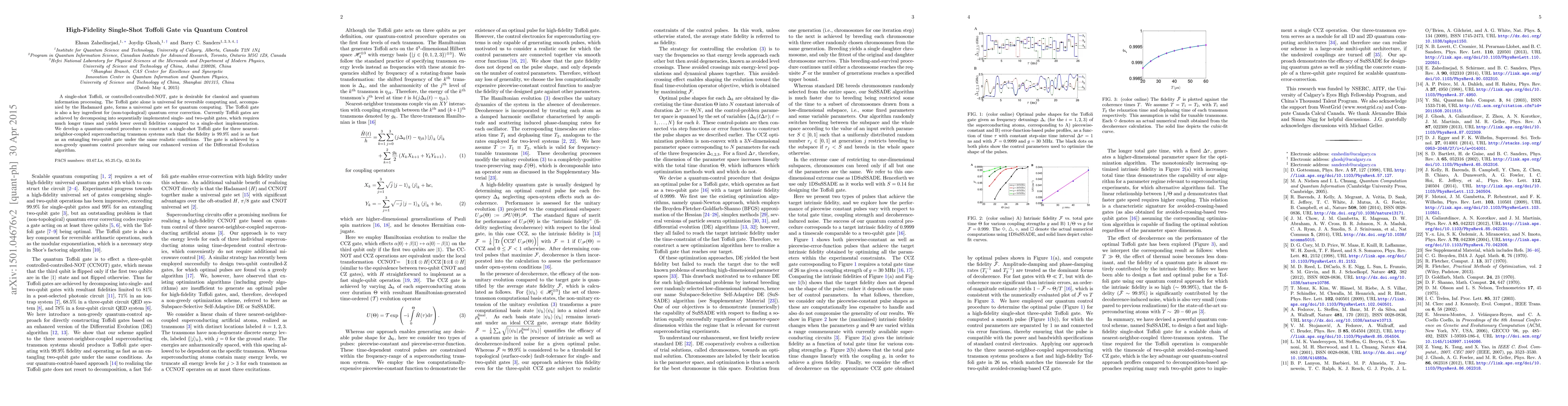 This paper presents a quantum-control method for constructing a high-fidelity single-shot Toffoli gate for three superconducting transmon qubits, achieving 99.9% fidelity and comparable speed to a two-qubit entangling gate, using an enhanced Differential Evolution algorithm. The Toffoli gate is crucial for reversible computing and quantum error correction.
