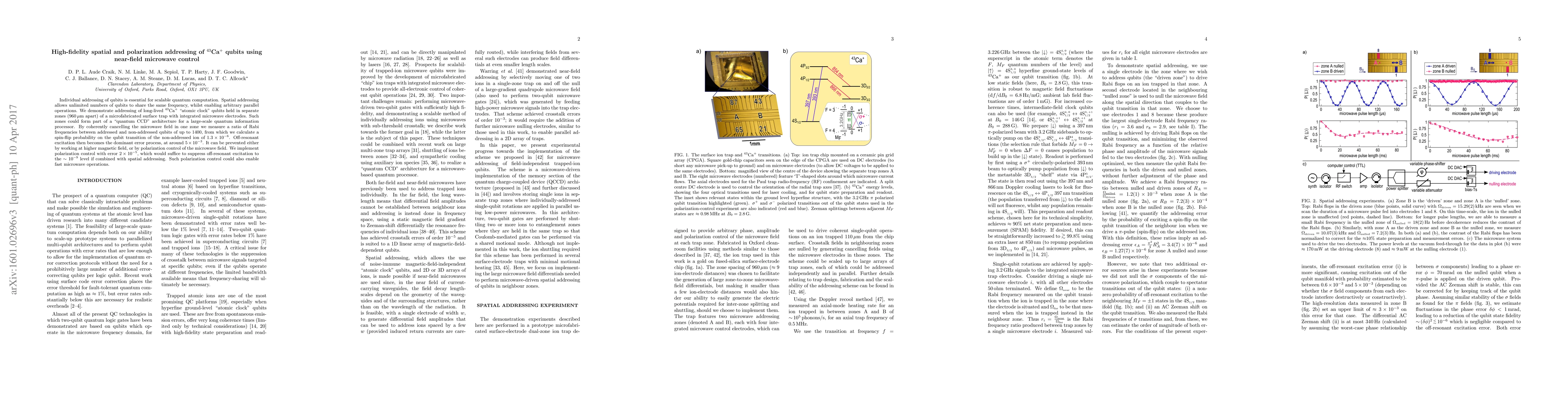 This paper demonstrates high-fidelity spatial and polarization control of $^{43}\text{Ca}^+$ qubits using near-field microwave techniques, achieving a Rabi frequency ratio of up to 1400 between addressed and non-addressed qubits. Polarization control reduces off-resonant excitation errors to $2 \times 10^{-5}$, potentially enabling scalable quantum computation.