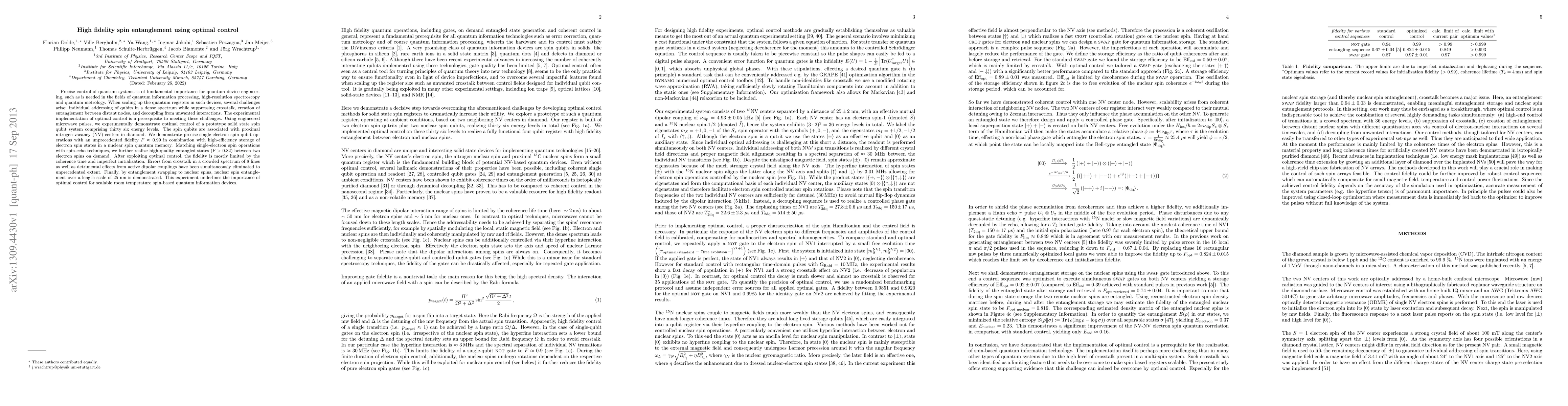 Precise control of quantum systems is of fundamental importance for quantum device engineering, such as is needed in the fields of quantum information processing, high-resolution spectroscopy and quantum metrology. When scaling up the quantum registers in such devices, several challenges arise: individual addressing of qubits in a dense spectrum while suppressing crosstalk, creation of entanglement between distant nodes, and decoupling from unwanted interactions. The experimental implementation of optimal control is a prerequisite to meeting these challenges. Using engineered microwave pulses, we experimentally demonstrate optimal control of a prototype solid state spin qubit system comprising thirty six energy levels. The spin qubits are associated with proximal nitrogen-vacancy (NV) centers in diamond. We demonstrate precise single-electron spin qubit operations with an unprecedented fidelity F \approx 0.99 in combination with high-efficiency storage of electron spin states in a nuclear spin quantum memory. Matching single-electron spin operations with spin-echo techniques, we further realize high-quality entangled states (F > 0.82) between two electron spins on demand. After exploiting optimal control, the fidelity is mostly limited by the coherence time and imperfect initialization. Errors from crosstalk in a crowded spectrum of 8 lines as well as detrimental effects from active dipolar couplings have been simultaneously eliminated to unprecedented extent. Finally, by entanglement swapping to nuclear spins, nuclear spin entanglement over a length scale of 25 nm is demonstrated. This experiment underlines the importance of optimal control for scalable room temperature spin-based quantum information devices.