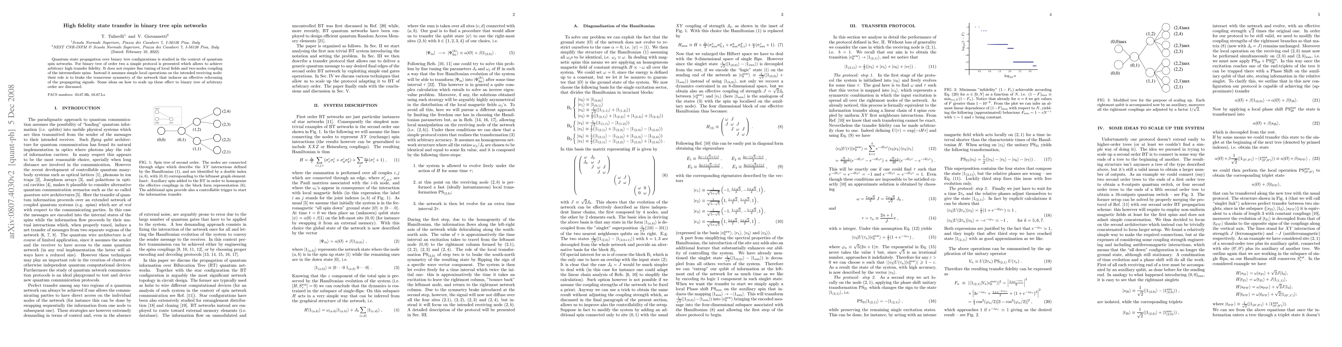 Quantum state propagation over binary tree configurations is studied in the context of quantum spin networks. For binary tree of order two a simple protocol is presented which allows to achieve arbitrary high transfer fidelity. It does not require fine tuning of local fields and two-nodes coupling of the intermediate spins. Instead it assumes simple local operations on the intended receiving node: their role is to brake the transverse symmetry of the network that induces an effective refocusing of the propagating signals. Some ideas on how to scale up these effect to binary tree of arbitrary order are discussed.