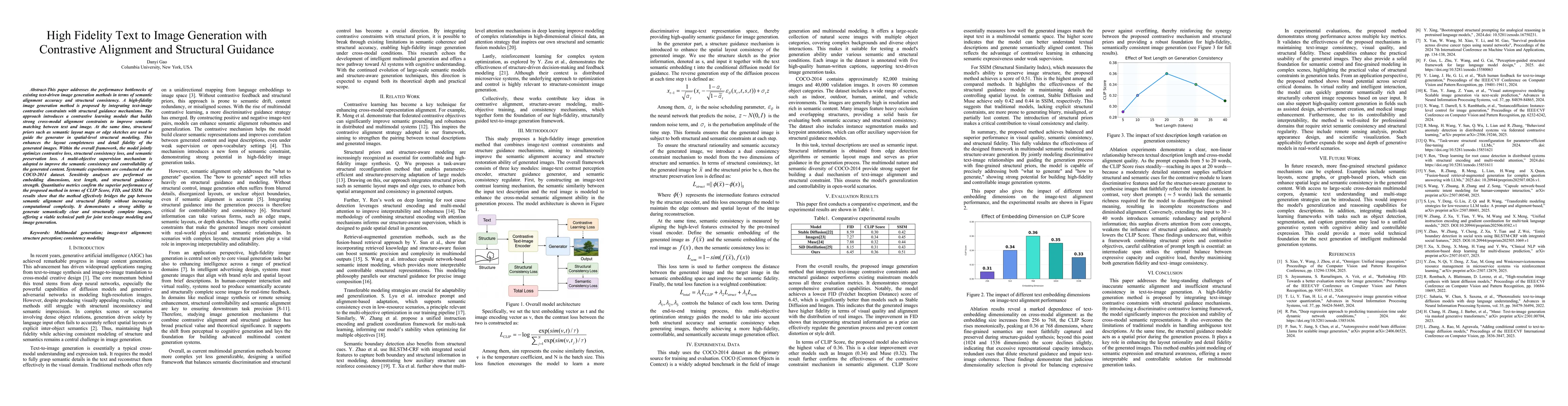 This paper addresses the performance bottlenecks of existing text-driven image generation methods in terms of semantic alignment accuracy and structural consistency. A high-fidelity image generation method is proposed by integrating text-image contrastive constraints with structural guidance mechanisms. The approach introduces a contrastive learning module that builds strong cross-modal alignment constraints to improve semantic matching between text and image. At the same time, structural priors such as semantic layout maps or edge sketches are used to guide the generator in spatial-level structural modeling. This enhances the layout completeness and detail fidelity of the generated images. Within the overall framework, the model jointly optimizes contrastive loss, structural consistency loss, and semantic preservation loss. A multi-objective supervision mechanism is adopted to improve the semantic consistency and controllability of the generated content. Systematic experiments are conducted on the COCO-2014 dataset. Sensitivity analyses are performed on embedding dimensions, text length, and structural guidance strength. Quantitative metrics confirm the superior performance of the proposed method in terms of CLIP Score, FID, and SSIM. The results show that the method effectively bridges the gap between semantic alignment and structural fidelity without increasing computational complexity. It demonstrates a strong ability to generate semantically clear and structurally complete images, offering a viable technical path for joint text-image modeling and image generation.