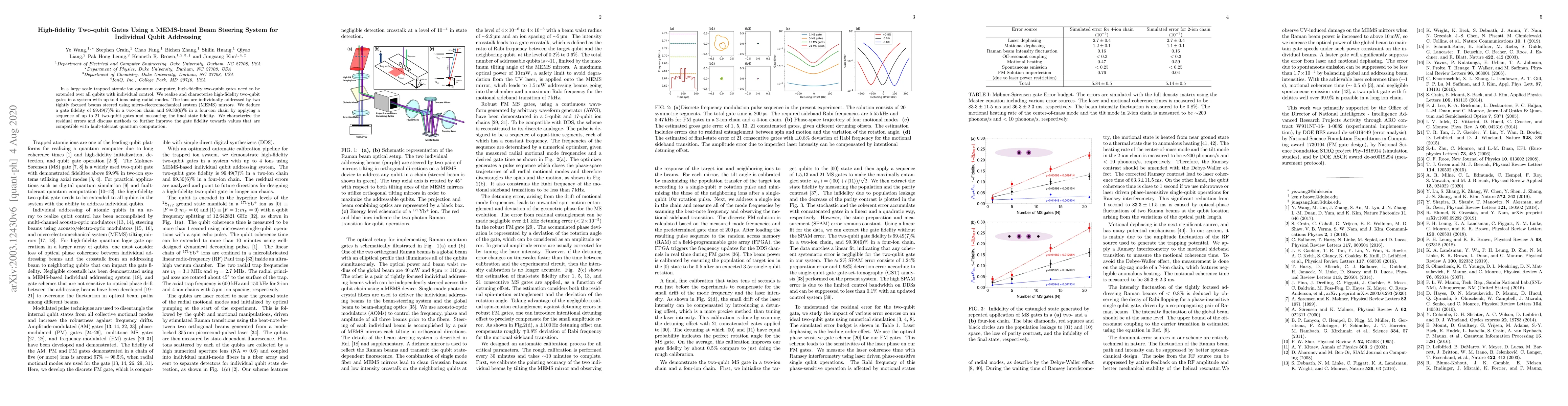 This paper demonstrates high-fidelity two-qubit gates in a trapped atomic ion quantum computer using MEMS-based beam steering for individual qubit addressing, achieving gate fidelities of 99.49(7)% for two ions and 99.30(6)% for four ions, and discusses methods to enhance these values for fault-tolerant quantum computation.
