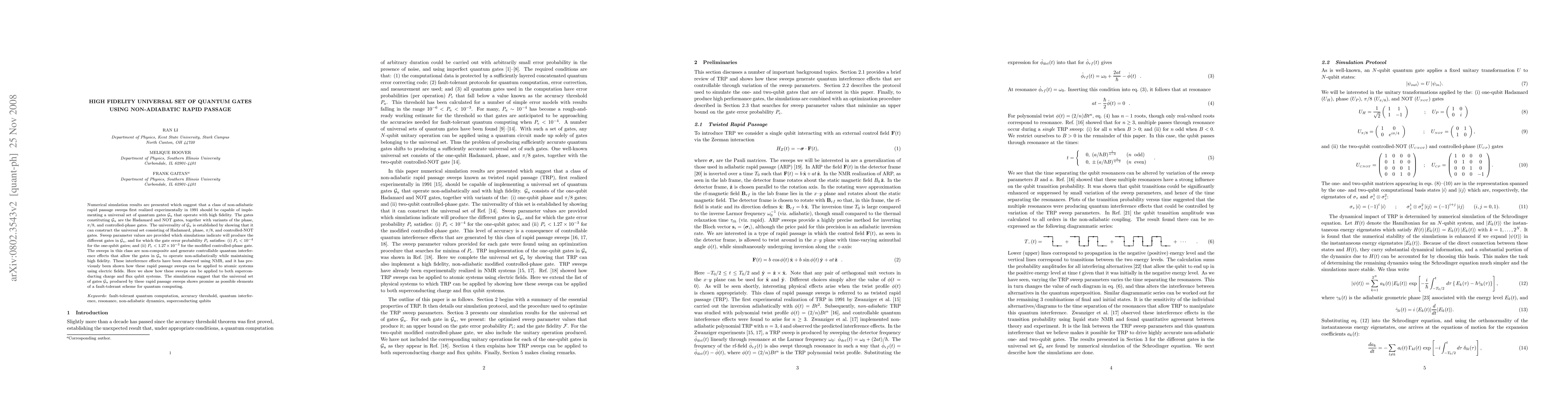 Numerical simulation results are presented which suggest that a class of non-adiabatic rapid passage sweeps first realized experimentally in 1991 should be capable of implementing a universal set of quantum gates G_{u} that operate with high fidelity. The gates constituting G_{u} are the Hadamard and NOT gates, together with variants of the phase, \pi /8, and controlled-phase gates. The universality of G_{u} is established by showing that it can construct the universal set consisting of Hadamard, phase, \pi /8, and controlled-NOT gates. Sweep parameter values are provided which simulations indicate will produce the different gates in G_{u}, and for which the gate error probability P_{e} satisfies: (i) P_{e} < 10^{-4} for the one-qubit gates; and (ii) P_{e} < 1.27x 10^{-3} for the modified controlled-phase gate. The sweeps in this class are non-composite and generate controllable quantum interference effects that allow the gates in G_{u} to operate non-adiabatically while maintaining high fidelity. These interference effects have been observed using NMR, and it has previously been shown how these rapid passage sweeps can be applied to atomic systems using electric fields. Here we show how these sweeps can be applied to both superconducting charge and flux qubit systems. The simulations suggest that the universal set of gates G_{u} produced by these rapid passage sweeps shows promise as possible elements of a fault-tolerant scheme for quantum computing.