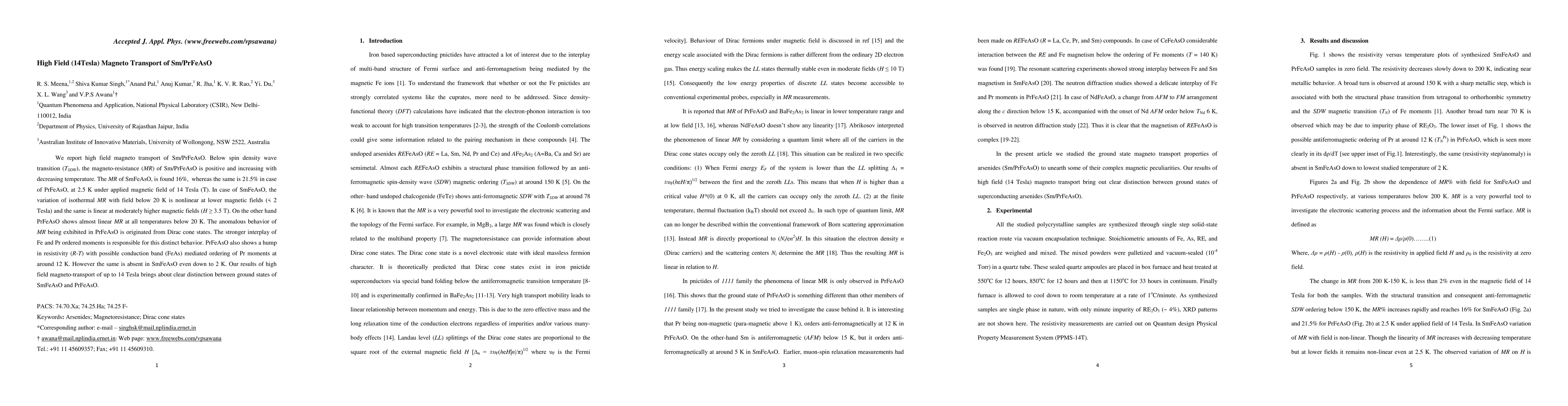 We report high field magneto transport of Sm/PrFeAsO. Below spin density wave transition (TSDW), the magneto-resistance (MR) of Sm/PrFeAsO is positive and increasing with decreasing temperature. The MR of SmFeAsO, is found 16%, whereas the same is 21.5% in case of PrFeAsO, at 2.5 K under applied magnetic field of 14 Tesla (T). In case of SmFeAsO, the variation of isothermal MR with field below 20 K is nonlinear at lower magnetic fields (< 2 Tesla) and the same is linear at moderately higher magnetic fields (H \geq 3.5 T). On the other hand PrFeAsO shows almost linear MR at all temperatures below 20 K. The anomalous behavior of MR being exhibited in PrFeAsO is originated from Dirac cone states. The stronger interplay of Fe and Pr ordered moments is responsible for this distinct behavior. PrFeAsO also shows a hump in resistivity (R-T) with possible conduction band (FeAs) mediated ordering of Pr moments at around 12 K. However the same is absent in SmFeAsO even down to 2 K. Our results of high field magneto-transport of up to 14 Tesla brings about clear distinction between ground states of SmFeAsO and PrFeAsO.