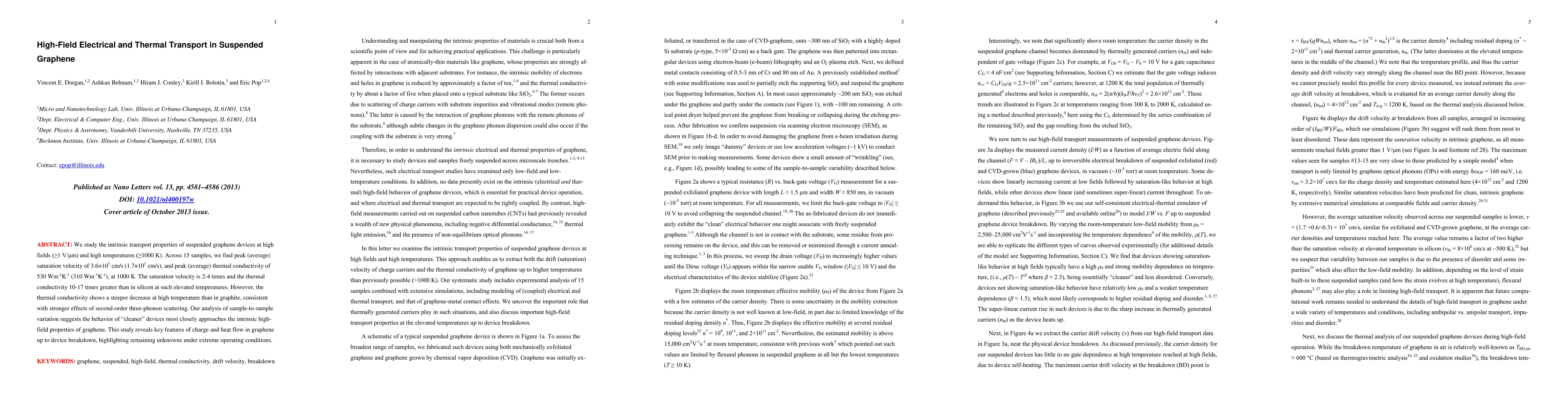 This study investigates the high-field electrical and thermal transport in suspended graphene, finding peak saturation velocities and thermal conductivities significantly higher than in silicon, while noting a steeper thermal conductivity decline at high temperatures due to stronger three-phonon scattering. Cleaner devices exhibit properties closer to intrinsic graphene behavior.