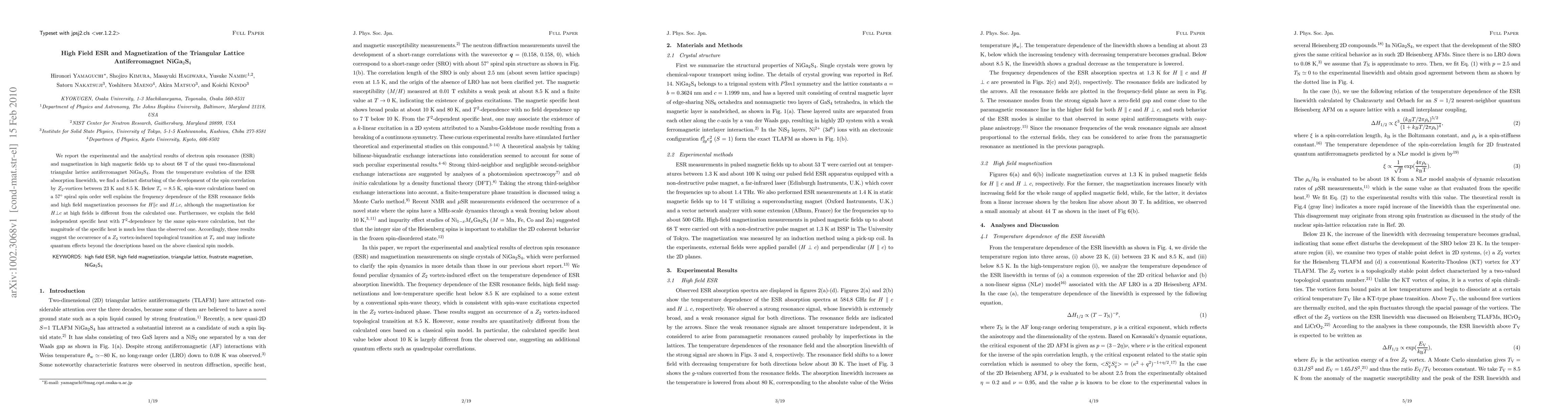 We report the experimental and the analytical results of electron spin resonance (ESR) and magnetization in high magnetic fields up to about 68 T of the quasi two-dimensional triangular lattice antiferromagnet NiGa$_2$S$_4$. From the temperature evolution of the ESR absorption linewidth, we find a distinct disturbing of the development of the spin correlation by $Z_2$-vortices between 23 K and 8.5 K. Below $T_{\rm{v}}=8.5$ K, spin-wave calculations based on a 57$^{\circ}$ spiral spin order well explains the frequency dependence of the ESR resonance fields and high field magnetization processes for $H$$\parallel$$c$ and $H$$\perp$$c$, although the magnetization for $H$$\perp$$c$ at high fields is different from the calculated one. Furthermore, we explain the field independent specific heat with $T^2$-dependence by the same spin-wave calculation, but the magnitude of the specific heat is much less than the observed one. Accordingly, these results suggest the occurrence of a $Z_2$ vortex-induced topological transition at $T_{\rm{v}}$ and may indicate quantum effects beyond the descriptions based on the above classical spin models.
