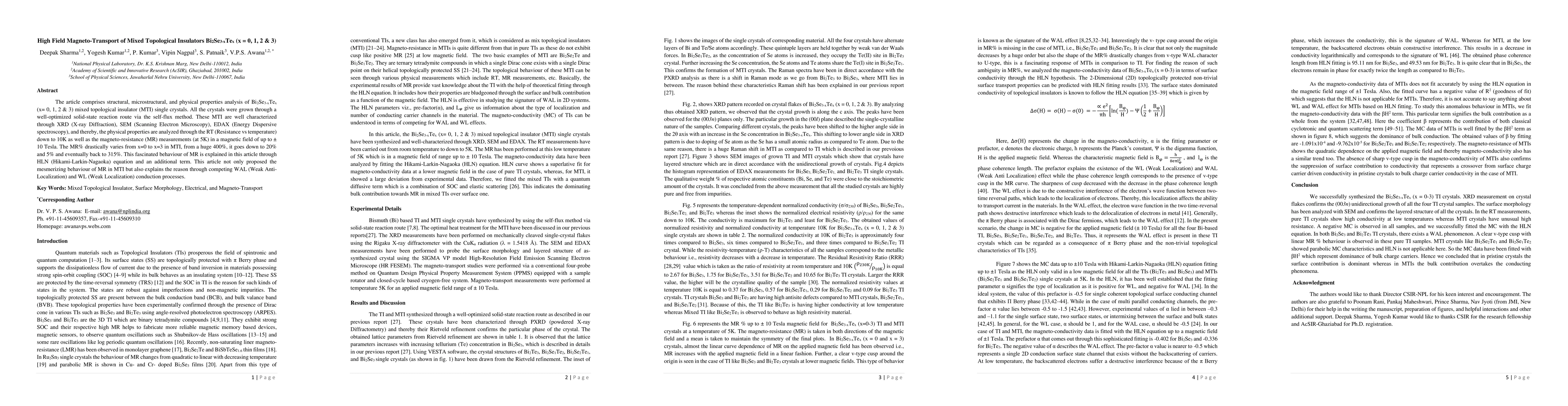 The article comprises structural, microstructural, and physical properties analysis of Bi2Se3-xTex (x= 0, 1, 2 and 3) mixed topological insulator (MTI) single crystals. All the crystals were grown through a well-optimized solid-state reaction route via the self-flux method. These MTI are well characterized through XRD (X-ray Diffraction), SEM (Scanning Electron Microscopy), EDAX (Energy Dispersive spectroscopy), and thereby, the physical properties are analyzed through the RT (Resistance vs temperature) down to 10K as well as the magneto-resistance (MR) measurements (at 5K) in a magnetic field of up to 10 Tesla. The MR drastically varies from x=0 to x=3 in MTI, from a huge 400 percent, it goes down to 20 percent and 5 percent and eventually back to 315 percent. This fascinated behaviour of MR is explained in this article through HLN (Hikami-Larkin-Nagaoka) equation and an additional term. This article not only proposed the mesmerizing behavior of MR in MTI but also explains the reason through competing WAL (Weak Anti-Localization) and WL (Weak Localization) conduction processes.