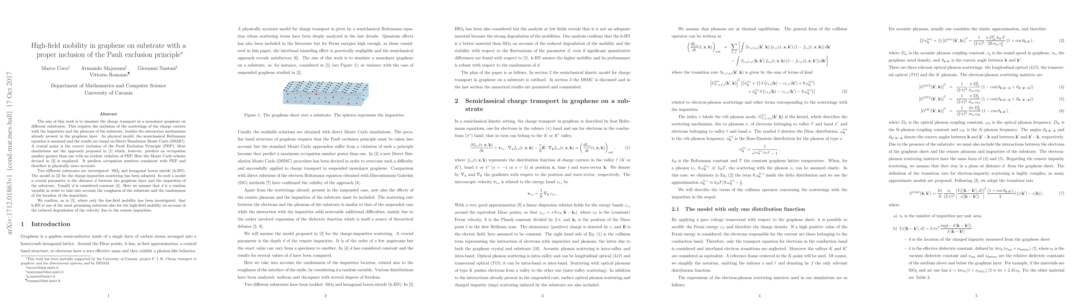 The aim of this work is to simulate the charge transport in a monolayer graphene on different substrates. This requires the inclusion of the scatterings of the charge carriers with the impurities and the phonons of the substrate, besides the interaction mechanisms already present in the graphene layer. As physical model, the semiclassical Boltzmann equation is assumed and the results are based on Direct Simulation Monte Carlo (DSMC). A crucial point is the correct inclusion of the Pauli Exclusion Principle (PEP). Two different substrates are investigated: SiO$_2$ and hexagonal boron nitride (h-BN). In the adopted model for the charge-impurities scattering, a crucial parameter is the distance $d$ between the graphene layer and the impurities of the substrate. Usually $d$ is considered constant. Here we assume that $d$ is a random variable in order to take into account the roughness of the substrate and the randomness of the location of the impurities. We confirm, where only the low-field mobility has been investigated, that h-BN is one of the most promising substrate also for the high-field mobility on account of the reduced degradation of the velocity due to the remote impurities.