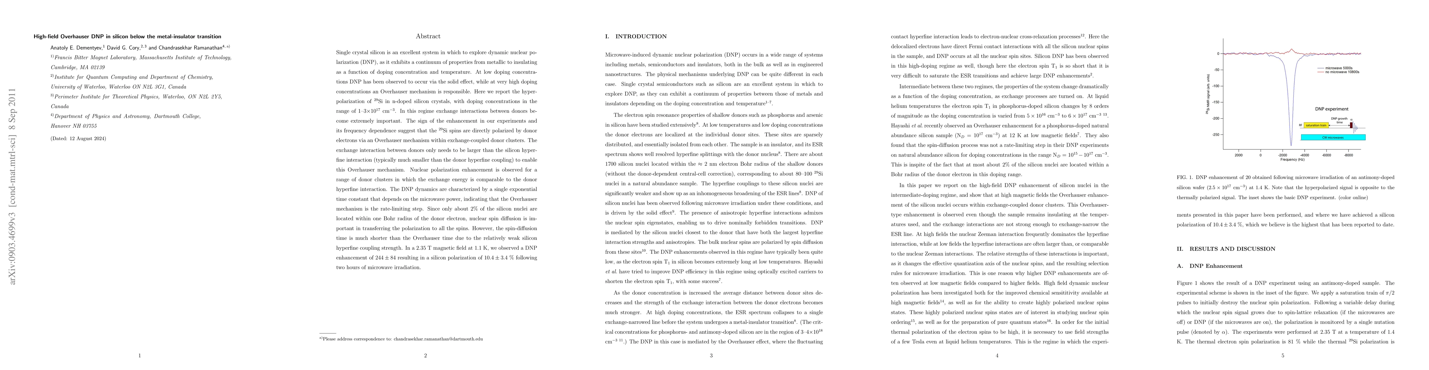 Single crystal silicon is an excellent system in which to explore dynamic nuclear polarization (DNP), as it exhibits a continuum of properties from metallic to insulating as a function of doping concentration and temperature. At low doping concentrations DNP has been observed to occur via the solid effect, while at very high doping concentrations an Overhauser mechanism is responsible. Here we report the hyperpolarization of 29Si in n-doped silicon crystals, with doping concentrations in the range of 1-3 x 10^17 /cc. In this regime exchange interactions between donors become extremely important. The sign of the enhancement in our experiments and its frequency dependence suggest that the 29Si spins are directly polarized by donor electrons via an Overhauser mechanism within exchange-coupled donor clusters. The exchange interaction between donors only needs to be larger than the silicon hyperfine interaction (typically much smaller than the donor hyperfine coupling) to enable this Overhauser mechanism. Nuclear polarization enhancement is observed for a range of donor clusters in which the exchange energy is comparable to the donor hyperfine interaction. The DNP dynamics are characterized by a single exponential time constant that depends on the microwave power, indicating that the Overhauser mechanism is the rate-limiting step. Since only about 2 % of the silicon nuclei are located within one Bohr radius of the donor electron, nuclear spin diffusion is important in transferring the polarization to all the spins. However, the spin-diffusion time is much shorter than the Overhauser time due to the relatively weak silicon hyperfine coupling strength. In a 2.35 T magnetic field at 1.1 K, we observed a DNP enhancement of $244 +/- 84 resulting in a silicon polarization of $10.4 +/- 3.4 % following two hours of microwave irradiation.