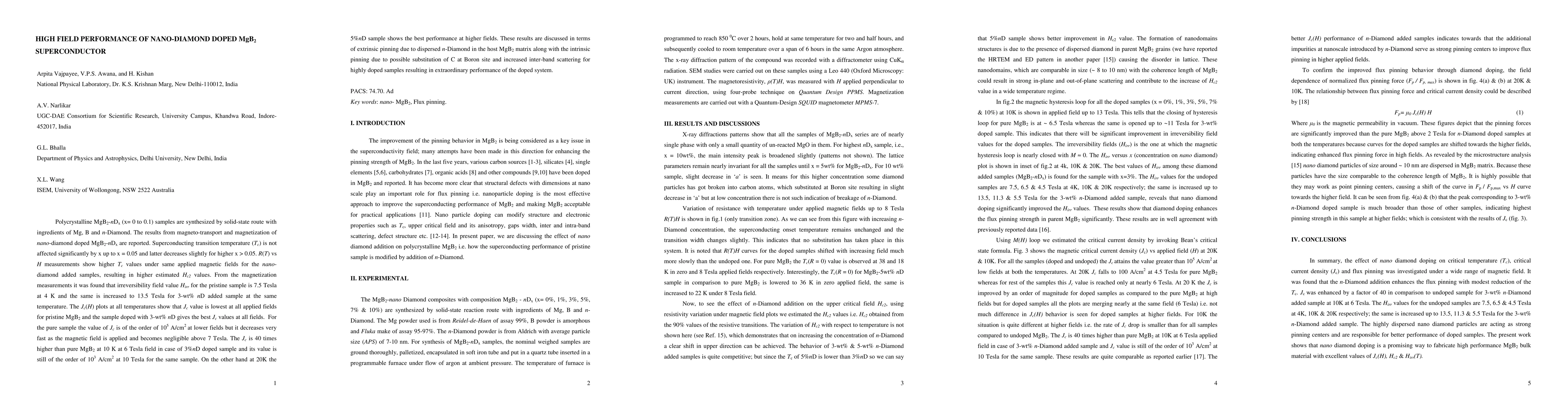 This study investigates the high-field performance of MgB2 superconductors doped with nano-diamond (nD). Results show that up to 5% nD doping does not significantly affect the superconducting transition temperature (Tc) but enhances critical current density (Jc) and critical magnetic field (Hc2), especially at lower fields. The 3% nD doped sample exhibits the best Jc values, maintaining high values even at higher magnetic fields, attributed to extrinsic pinning from nD and intrinsic pinning mechanisms.