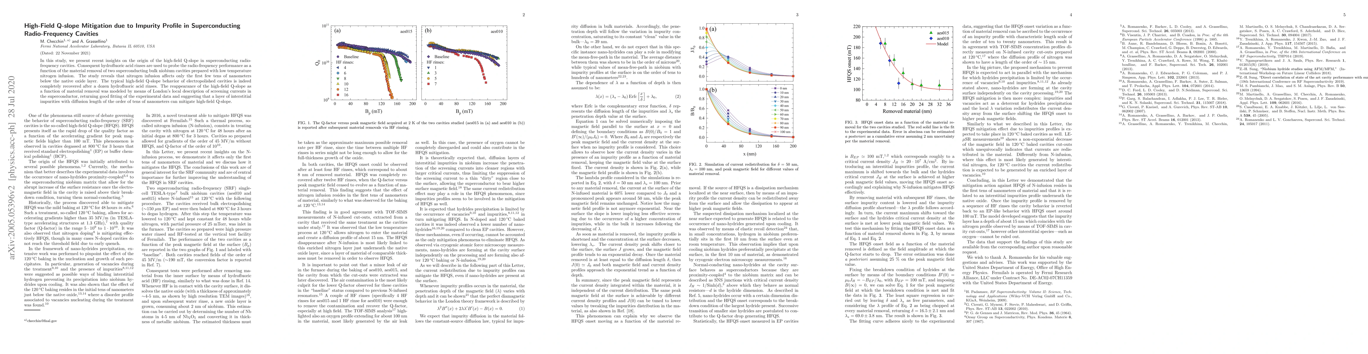 In this study, we present new insights on the origin of the high-field Q-slope in superconducting radio-frequency cavities. Consequent hydrofluoric acid rinses are used to probe the radio-frequency performance as a function of the material removal of two superconducting bulk niobium cavities prepared with low temperature nitrogen infusion. The study reveals that nitrogen infusion affects only the first few tens of nanometers below the native oxide layer. The typical high-field Q-slope behavior of electropolished cavities is indeed completely recovered after a dozen hydrofluoric acid rinses. The reappearance of the high-field Q-slope as a function of material removal was modeled by means of London's local description of screening currents in the superconductor, returning good fitting of the experimental data and suggesting that interstitial impurities layers with diffusion length of the order to tens of nanometers can mitigate high-field Q-slope.