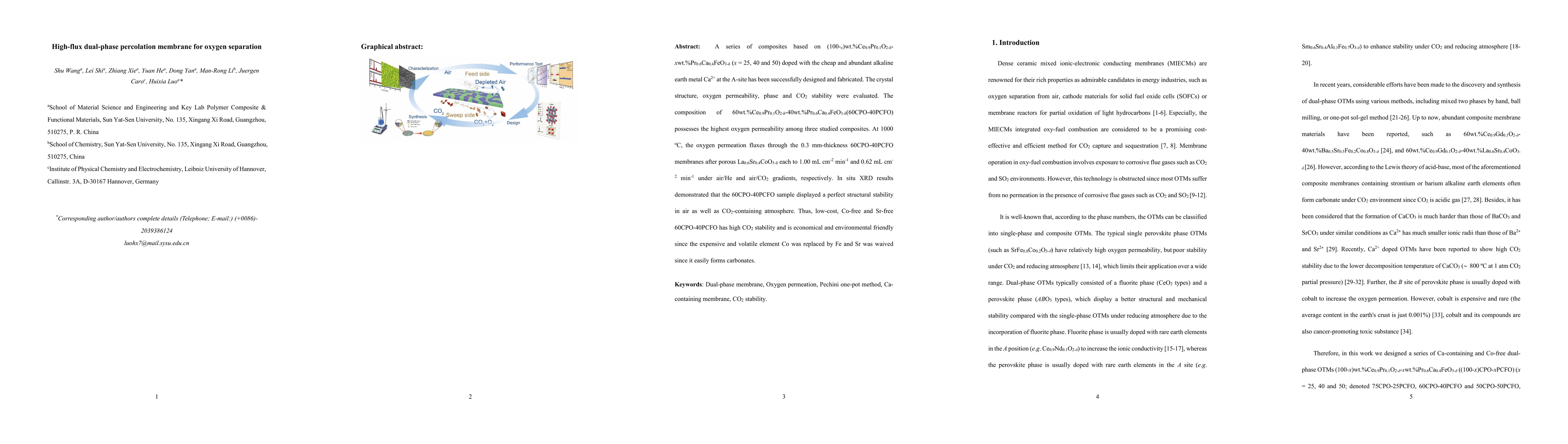 A series of composites based on (100-x)wt.%Ce0.9Pr0.1O2-{\delta}-xwt.%Pr0.6Ca0.4FeO3-{\delta} (x = 25, 40 and 50) doped with the cheap and abundant alkaline earth metal Ca2+ at the A-site has been successfully designed and fabricated. The crystal structure, oxygen permeability, phase and CO2 stability were evaluated. The composition of 60wt.%Ce0.9Pr0.1O2-{\delta}-40wt.%Pr0.6Ca0.4FeO3-{\delta}(60CPO-40PCFO) possesses the highest oxygen permeability among three studied composites. At 1000 oC, the oxygen permeation fluxes through the 0.3 mm-thickness 60CPO-40PCFO membranes after porous La0.6Sr0.4CoO3-{\delta} each to 1.00 mL cm-2 min-1 and 0.62 mL cm-2 min-1 under air/He and air/CO2 gradients, respectively. In situ XRD results demonstrated that the 60CPO-40PCFO sample displayed a perfect structural stability in air as well as CO2-containing atmosphere. Thus, low-cost, Co-free and Sr-free 60CPO-40PCFO has high CO2 stability and is economical and environmental friendly since the expensive and volatile element Co was replaced by Fe and Sr was waived since it easily forms carbonates.