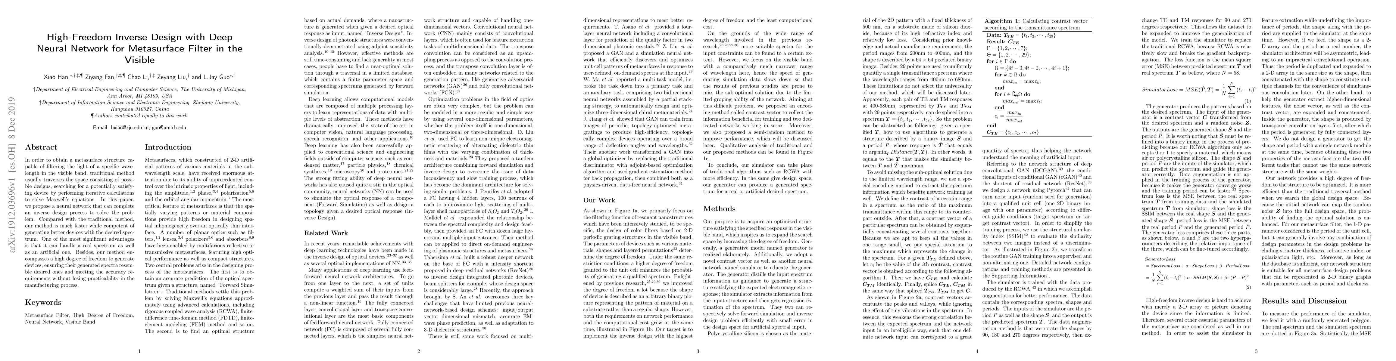 In order to obtain a metasurface structure capable of filtering the light of a specific wavelength in the visible band, traditional method usually traverses the space consisting of possible designs, searching for a potentially satisfying device by performing iterative calculations to solve Maxwell's equations. In this paper, we propose a neural network that can complete an inverse design process to solve the problem. Compared with the traditional method, our method is much faster while competent of generating better devices with the desired spectrum. One of the most significant advantages is that it can handle a real spectrum as well as an artificial one. Besides, our method encompasses a high degree of freedom to generate devices, ensuring their generated spectra resemble desired ones and meeting the accuracy requirements without losing practicability in the manufacturing process.