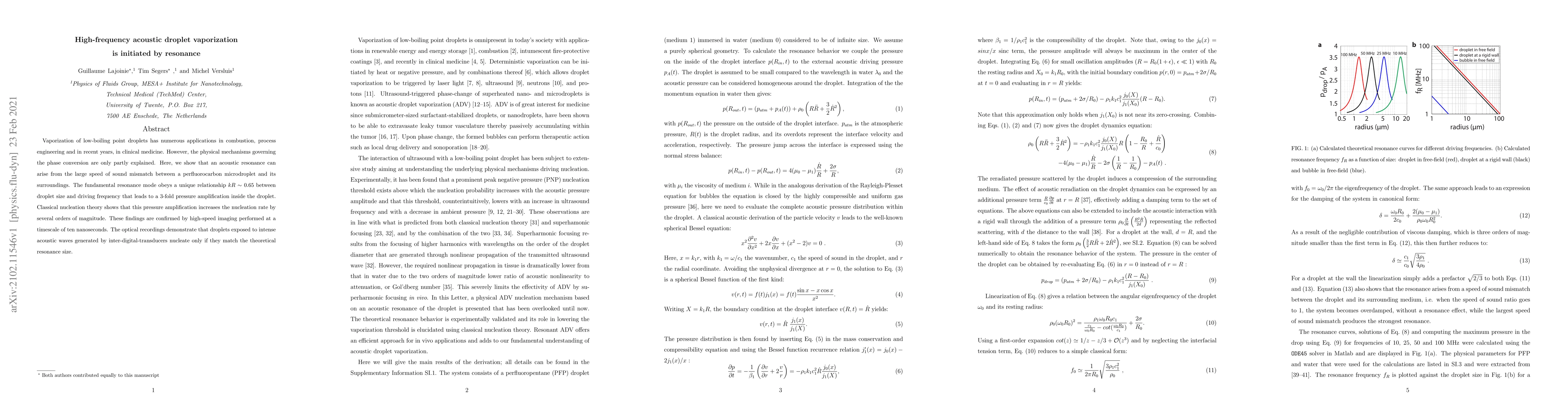 Vaporization of low-boiling point droplets has numerous applications in combustion, process engineering and in recent years, in clinical medicine. However, the physical mechanisms governing the phase conversion are only partly explained. Here, we show that an acoustic resonance can arise from the large speed of sound mismatch between a perfluorocarbon microdroplet and its surroundings. The fundamental resonance mode obeys a unique relationship $kR$~$\sim$ 0.65 between droplet size and driving frequency that leads to a 3-fold pressure amplification inside the droplet. Classical nucleation theory shows that this pressure amplification increases the nucleation rate by several orders of magnitude. These findings are confirmed by high-speed imaging performed at a timescale of ten nanoseconds. The optical recordings demonstrate that droplets exposed to intense acoustic waves generated by inter-digital-transducers nucleate only if they match the theoretical resonance size.