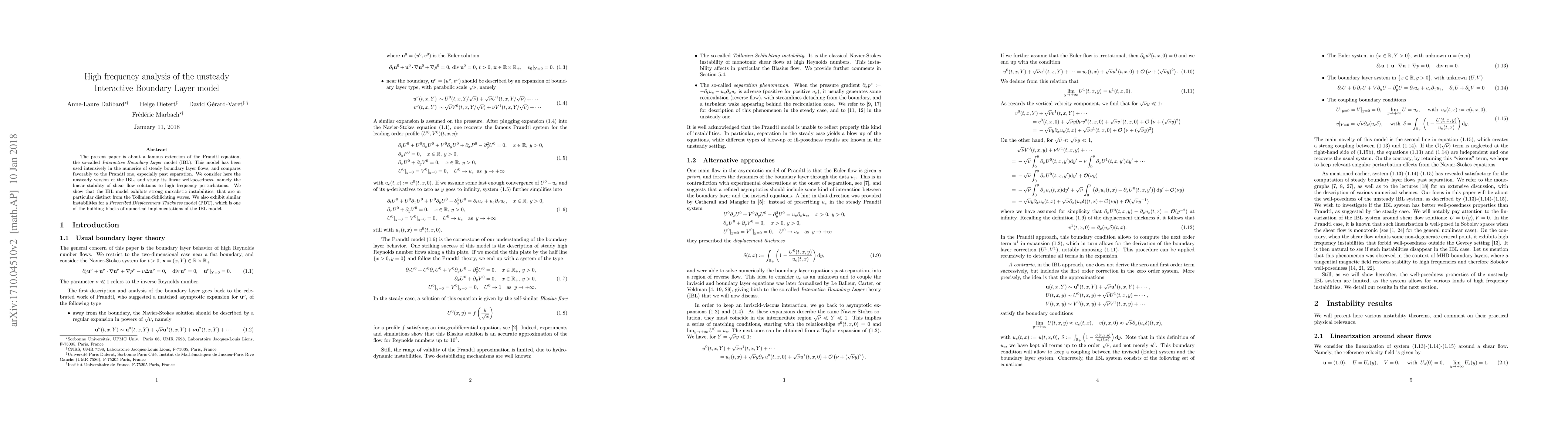 Researchers analyzed the unsteady Interactive Boundary Layer model and found it to exhibit strong unrealistic instabilities under high-frequency perturbations, distinct from known Tollmien-Schlichting waves.