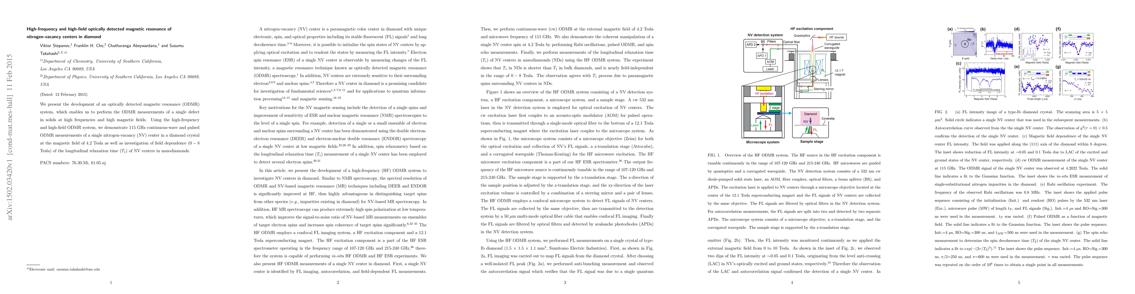 This research develops an optically detected magnetic resonance (ODMR) system for high-frequency and high-field measurements, achieving 115 GHz ODMR of nitrogen-vacancy centers in diamond at 4.2 Tesla, and examines the longitudinal relaxation time ($T_1$) dependence across a magnetic field range of 0-8 Tesla.
