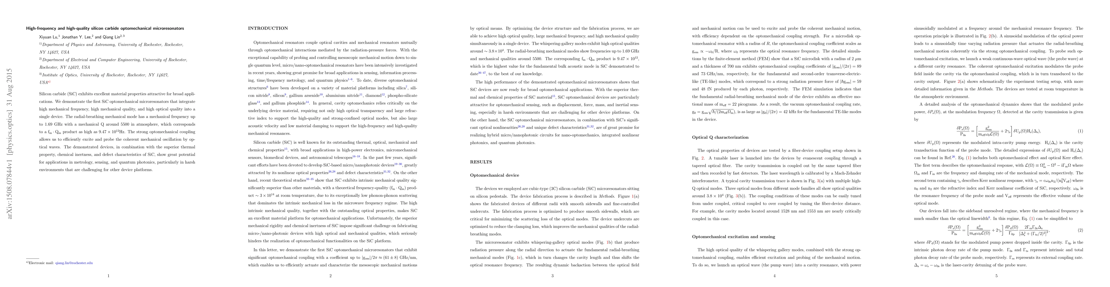 This paper demonstrates high-frequency and high-quality silicon carbide optomechanical microresonators, achieving a mechanical frequency up to 1.69 GHz and a mechanical Q of around 5500, showing great potential for applications in metrology, sensing, and quantum photonics. The strong optomechanical coupling and SiC's superior properties make these devices ideal for harsh environments.