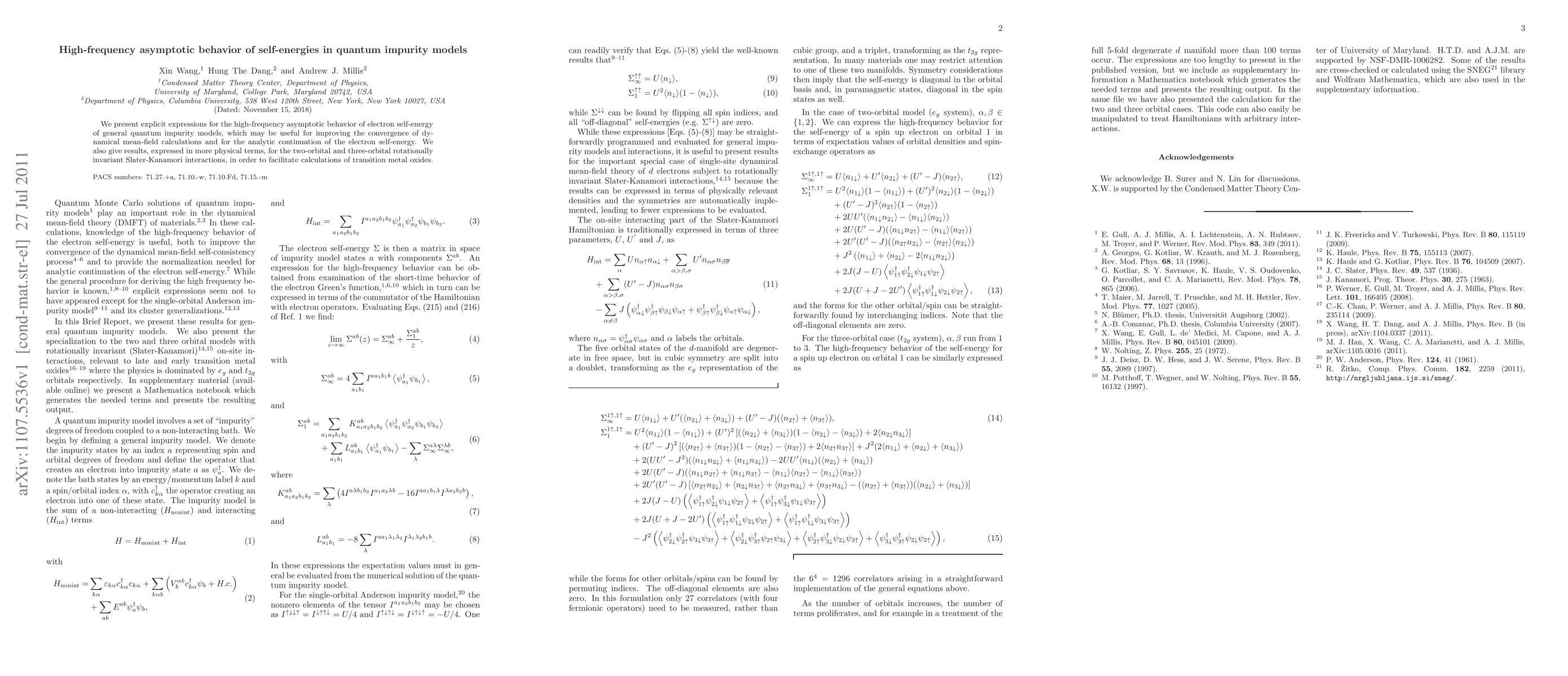 We present explicit expressions for the high-frequency asymptotic behavior of electron self-energy of general quantum impurity models, which may be useful for improving the convergence of dynamical mean-field calculations and for the analytic continuation of the electron self-energy. We also give results, expressed in more physical terms, for the two-orbital and three-orbital rotationally invariant Slater-Kanamori interactions, in order to facilitate calculations of transition metal oxides.