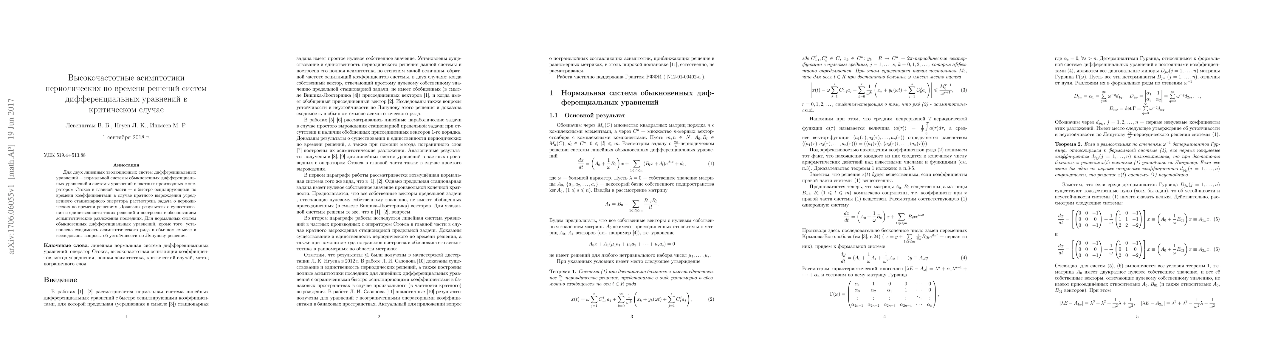 For two linear evolution differential equations systems - a normal ordinary differential equations system and a partial differential equations system with Stokes operator in a main part - with rapidly oscillating by time coefficients in a case of an averaged stationary operator multiple degeneracy time-periodic solutions problem was considered. The results about their existence and uniqueness were proved and their asymptotic expansions were constructed and proved. Moreover, for normal ordinary differential equations system the convergence of the asymptotic expansion was proved in the ordinary meaning and Lyapunov's stability questions were investigated.