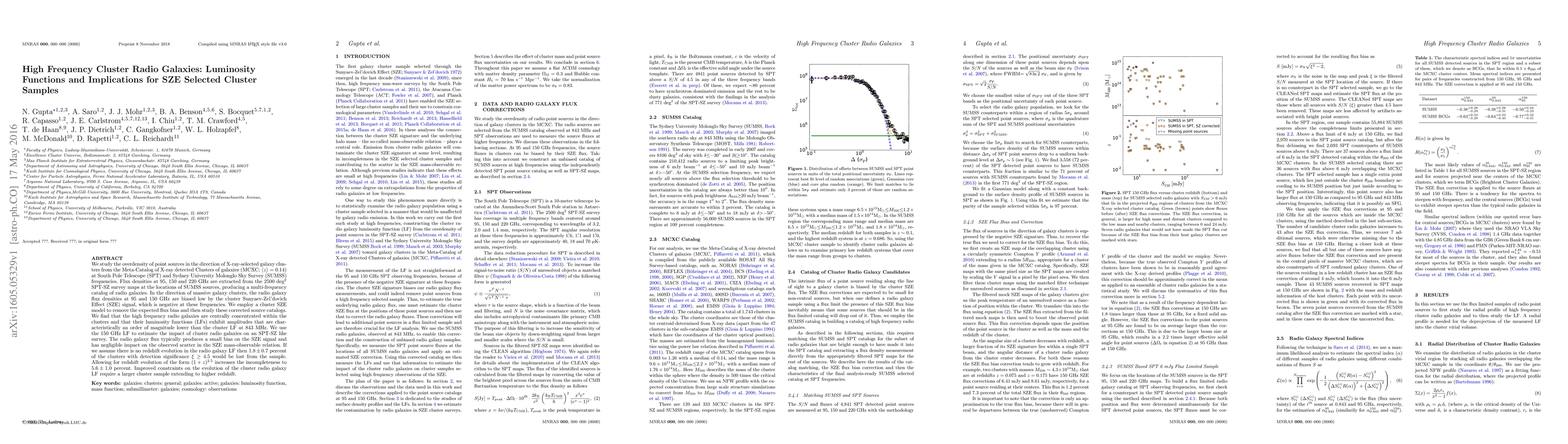 We study the overdensity of point sources in the direction of X-ray-selected galaxy clusters from the Meta-Catalog of X-ray detected Clusters of galaxies (MCXC; $\langle z \rangle = 0.14$) at South Pole Telescope (SPT) and Sydney University Molonglo Sky Survey (SUMSS) frequencies. Flux densities at 95, 150 and 220 GHz are extracted from the 2500 deg$^2$ SPT-SZ survey maps at the locations of SUMSS sources, producing a multi-frequency catalog of radio galaxies. In the direction of massive galaxy clusters, the radio galaxy flux densities at 95 and 150 GHz are biased low by the cluster Sunyaev-Zel'dovich Effect (SZE) signal, which is negative at these frequencies. We employ a cluster SZE model to remove the expected flux bias and then study these corrected source catalogs. We find that the high frequency radio galaxies are centrally concentrated within the clusters and that their luminosity functions (LFs) exhibit amplitudes that are characteristically an order of magnitude lower than the cluster LF at 843 MHz. We use the 150 GHz LF to estimate the impact of cluster radio galaxies on an SPT-SZ like survey. The radio galaxy flux typically produces a small bias on the SZE signal and has negligible impact on the observed scatter in the SZE mass-observable relation. If we assume there is no redshift evolution in the radio galaxy LF then $1.8\pm0.7$ percent of the clusters would be lost from the sample. Allowing for redshift evolution of the form $(1+z)^{2.5}$ increases the incompleteness to $5.6\pm1.0$ percent. Improved constraints on the evolution of the cluster radio galaxy LF require a larger cluster sample extending to higher redshift.